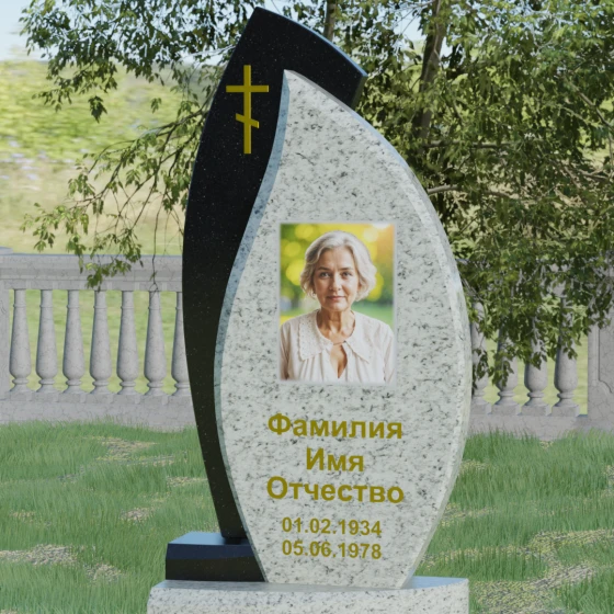 Основой художественного замысла выступает эффектная асимметрия и игра контрастных фактур. Центральная часть надгробия, предназначенная для размещения портрета и памятных надписей, выполнена в форме изящного лепестка или капли из глубокого черного камня. Ее плавные, текучие линии символизируют бесконечность бытия и чистоту души. Оправа, охватывающая центральный элемент с левой стороны, имеет более строгую, динамичную геометрию с выраженным острым углом в верхней части, что создает визуальный эффект защищенности и опоры. Особое внимание уделено деталям: на левом «крыле» композиции лаконично расположился восьмиконечный православный крест, выполненный в технике глубокой гравировки с последующим золочением. Это придает всей конструкции духовную завершенность и благородство.