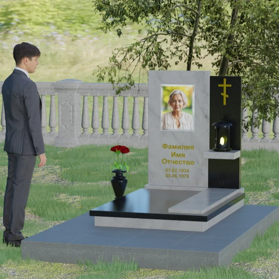 Кому подойдет: Данная модель является универсальной благодаря своему лаконичному и одновременно глубокому дизайну. Она станет достойным выбором как для мужчины, так и для женщины. Строгость линий и золотые акценты подчеркнут статус и мужество, а плавные изгибы верхней грани привнесут нотки женственности и нежности. Этот мемориал выбирают те, кто хочет выразить глубокое уважение и создать на кладбище место, преисполненное достоинства и тишины, где каждый элемент — от лампады до фактуры камня — говорит о вечной любви.
