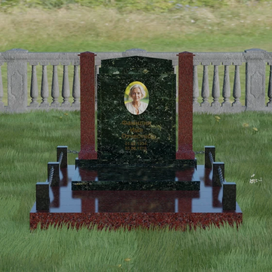 Главной особенностью данного комплекса являются две декоративные колонны, обрамляющие центральную стелу. Эти стройные вертикальные столбы не просто дополняют дизайн, но и служат символом опоры, духовной стойкости и незыблемости памяти. Контрастное сочетание фактур и цветов, представленное в разных вариациях модели, позволяет расставить акценты: выделить центральную часть для портрета или, наоборот, подчеркнуть строгость боковых пилонов. Зеркальная полировка каждой грани создает удивительную игру света — поверхность камня отражает мир вокруг, словно запечатлевая в себе само течение времени, при этом сохраняя безупречный блеск на многие десятилетия.