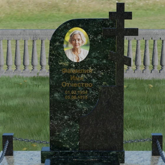 Геометрия стелы диктует свои правила гармоничного оформления. В верхней левой части предусмотрено идеальное пространство для размещения портрета — лучше всего здесь смотрится классический овальный керамический медальон, который мягко вписывается в закругление камня. Гравировка надписей выполняется сусальным золотом или глубоким пескоструйным методом, что на фоне темного полированного гранита выглядит особенно благородно и читабельно.