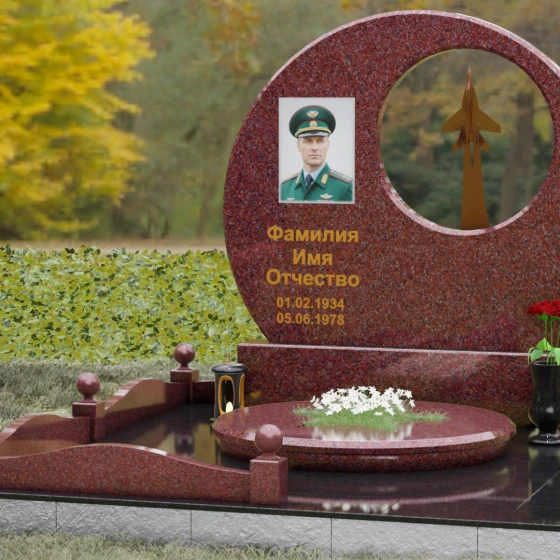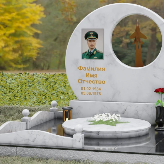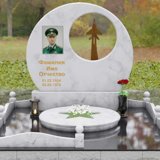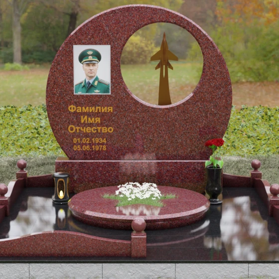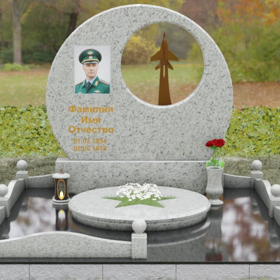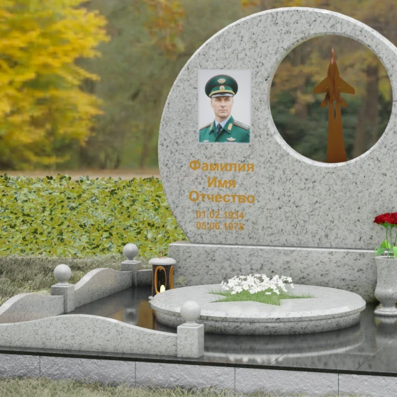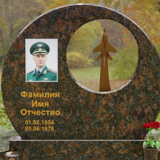 Выбор мемориальной композиции — это всегда поиск баланса между земной скорбью и небесным триумфом человеческого духа. Данная величественная стела, выполненная в уникальной геометрии круга с асимметричным сквозным вырезом, представляет собой не просто памятный знак, а глубокое философское высказывание. Символизм окружности отсылает нас к идее бесконечности, небесного свода и завершенности жизненного пути. Внутреннее пространство стелы акцентировано филигранной металлической фигурой взмывающего ввысь истребителя. Этот элемент несет в себе мощный эмоциональный заряд: он олицетворяет прорыв сквозь земные преграды, вечный полет и верность призванию, которое сильнее самой смерти.