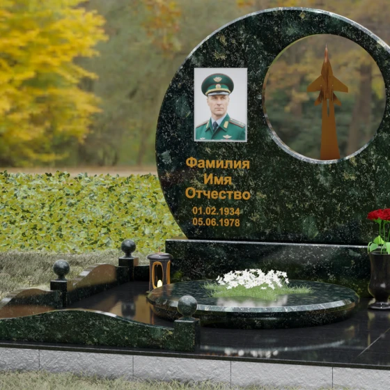 Эстетика монумента строится на игре объемов и пустот. Идеально ровная, зеркальная поверхность камня контрастирует с воздушностью сквозного проема, создавая эффект динамики. Каждая грань изделия проходит многоступенчатую обработку, достигая безупречной гладкости, в которой отражается мир, подчеркивая неразрывную связь ушедшего человека с живой природой. Золотое тиснение шрифтов и портретное изображение, расположенное в левой части композиции, уравновешивают визуальный вес парящего самолета, создавая гармоничный и цельный образ, достойный памяти героя.