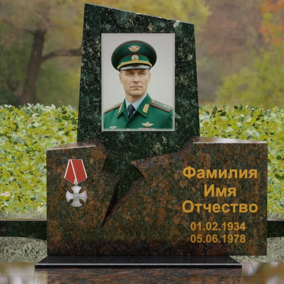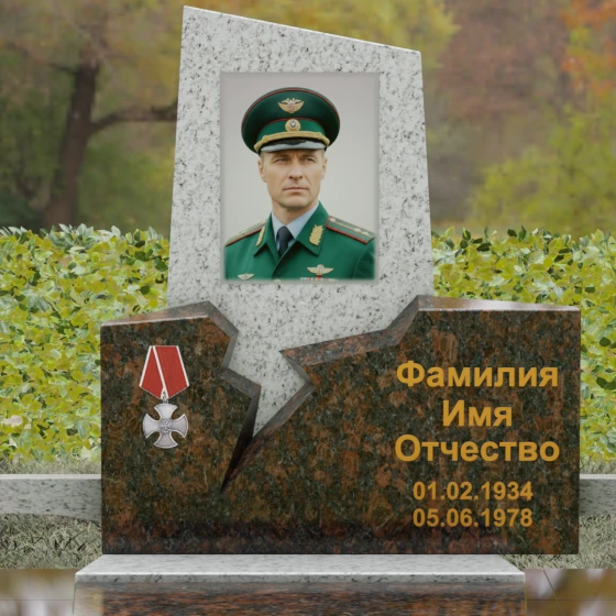 Представленная вашему вниманию величественная стела (Артикул 187) — это не просто мемориальный знак, а глубокое художественное произведение, в котором запечатлена эстетика мужества и непоколебимой воли. Композиция построена на резком, драматичном контрасте двух видов камня и сложных геометрических форм. Верхний сегмент, выполненный из глубокого черного гранита с зеркальной полировкой, устремлен ввысь, символизируя чистоту помыслов и вечный покой. Его асимметричный срез придает монументу динамику и современный вид. Нижняя часть комплекса, созданная из фактурного красно-коричневого гранита, олицетворяет земную твердь и крепость характера. Особого внимания заслуживает художественный разлом — рваная, зигзагообразная линия соприкосновения двух плит. Этот «разлом времени» выглядит максимально натуралистично, создавая визуальное ощущение мощи, способной преодолеть саму смерть. На левой стороне мемориала гордо расположена объемная резьба в виде ордена Мужества с алой лентой, что подчеркивает особый статус и заслуги усопшего.