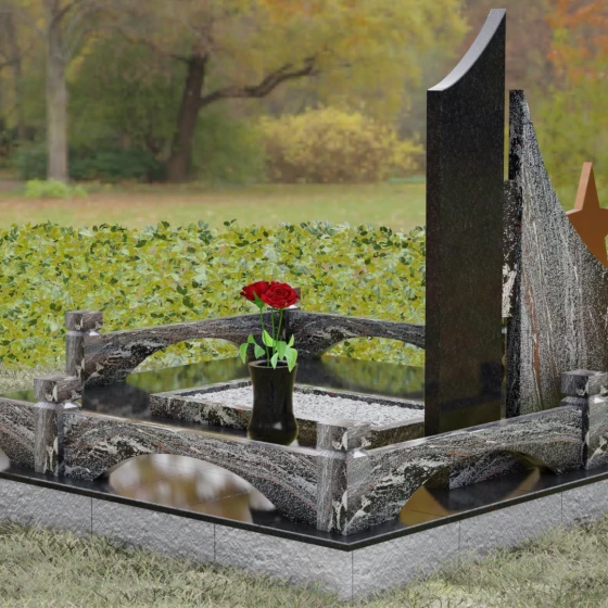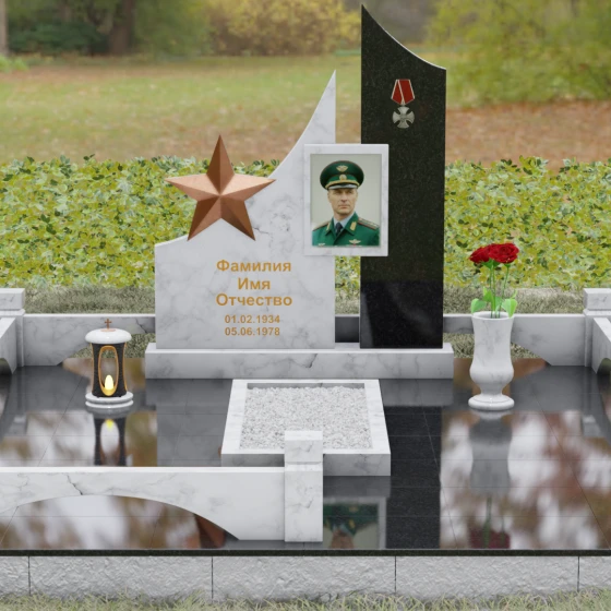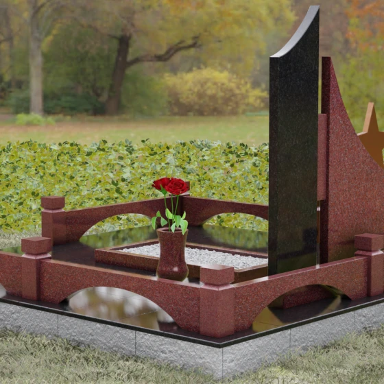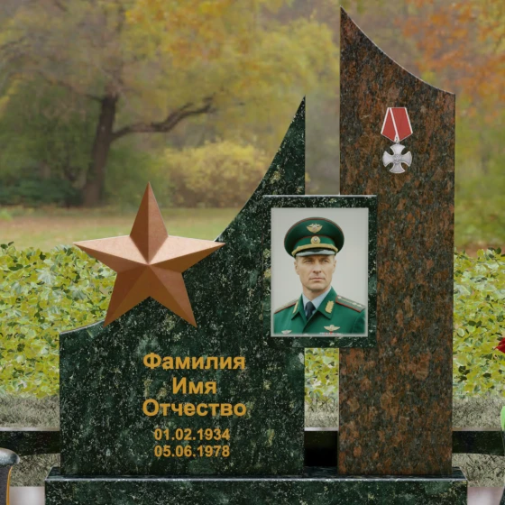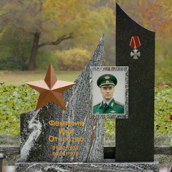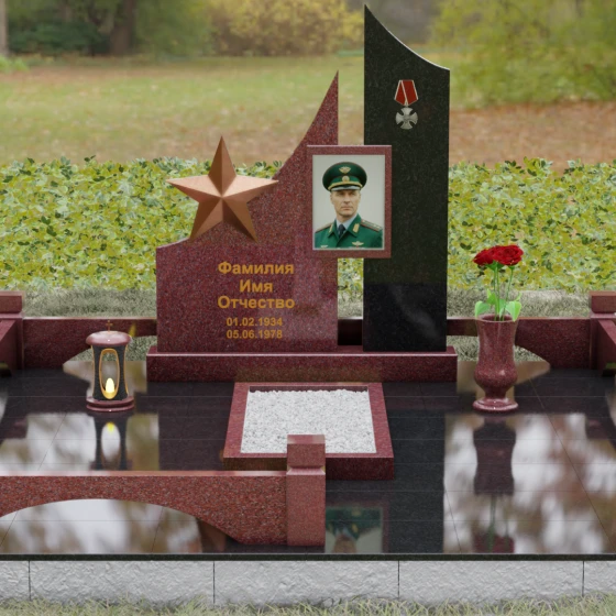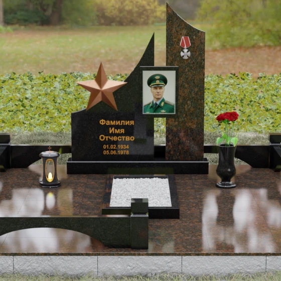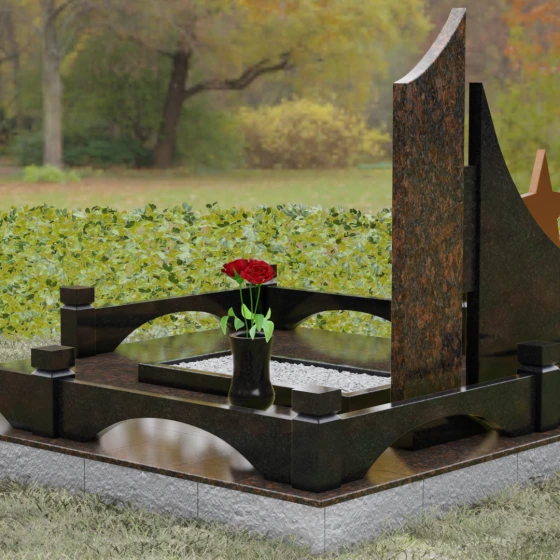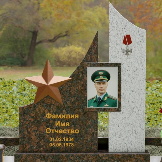 В основе художественной концепции лежит динамичная асимметрия, которая придает всей структуре современный, «европейский» облик. Центральная стела состоит из двух контрастных блоков, объединенных общим основанием. Левая часть, выполненная из темного полированного камня, имеет резкий диагональный срез, направленный вверх. На ее вершине закреплена объемная пятиконечная звезда с эффектом бронзового напыления — мощный акцент, подчеркивающий статус и заслуги покойного. Правая часть композиции представляет собой высокий вертикальный пилон из фактурного коричнево-красного гранита, на верхнем сегменте которого расположена детальная реплика ордена Мужества.
