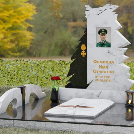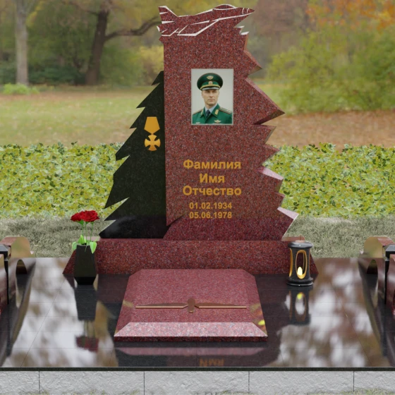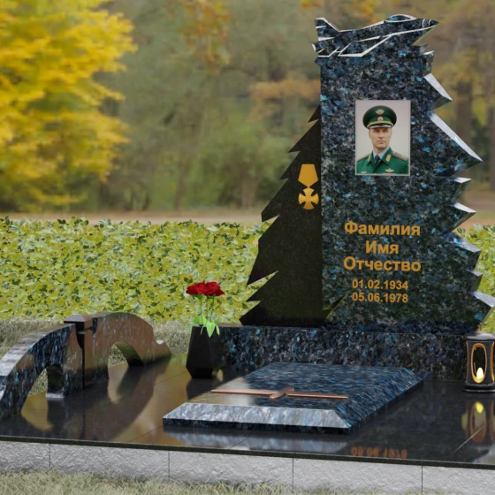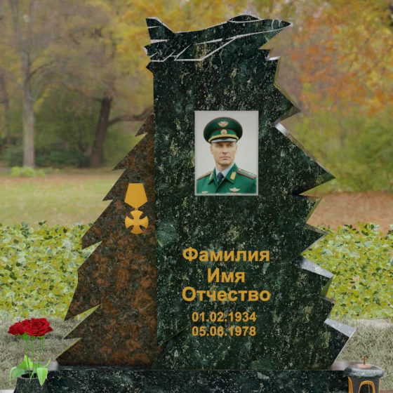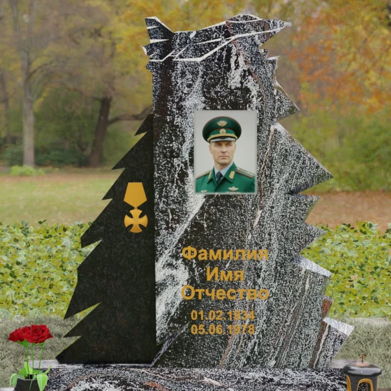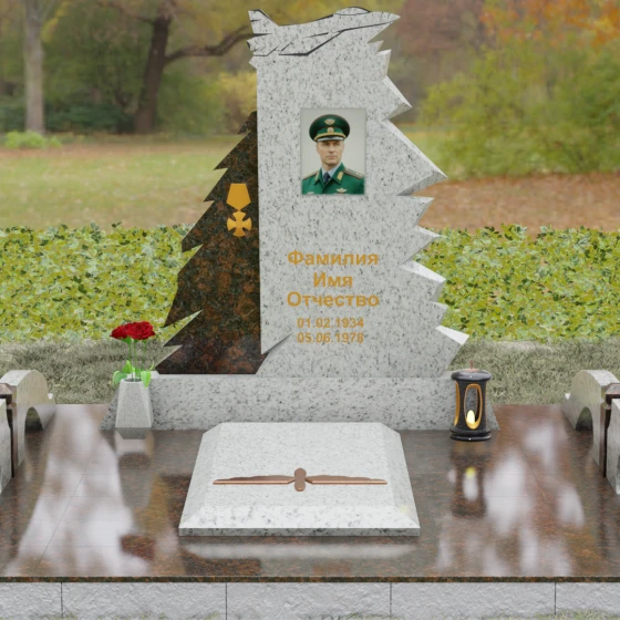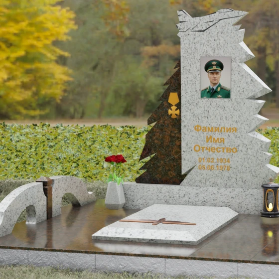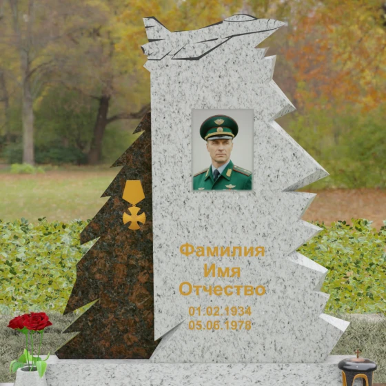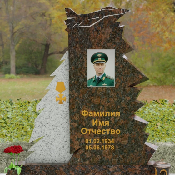 Надгробие из натурального камня (Артикул 202) — это монументальная композиция, созданная для того, чтобы увековечить память о человеке чести, чья жизнь была неразрывно связана с небом и служением отечеству. Архитектурное решение стелы поражает своей динамикой и символизмом: в верхней части монумента застыл в стремительном взлете силуэт современного истребителя, выполненный с ювелирной точностью. Левая грань памятника решена в виде резных, асимметричных выступов, напоминающих ветви северной ели или ломаные линии скалистого утеса. Такая геометрия придает мемориалу мужественный, волевой характер, подчеркивая стойкость и твердость духа ушедшего. Игра ломаных линий и острых углов создает ощущение мощи, которое невозможно передать в классических прямоугольных формах.