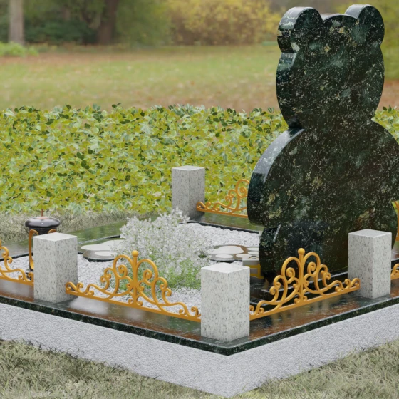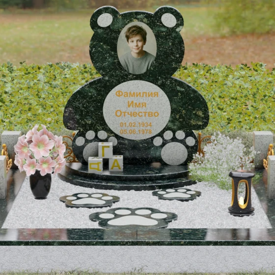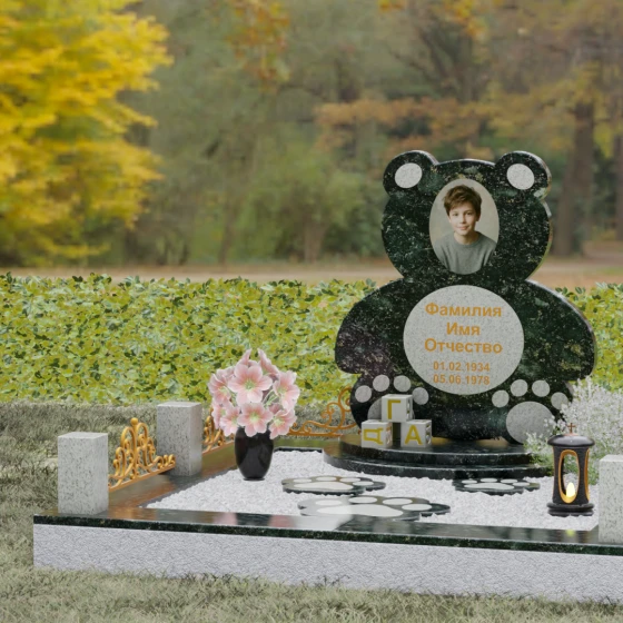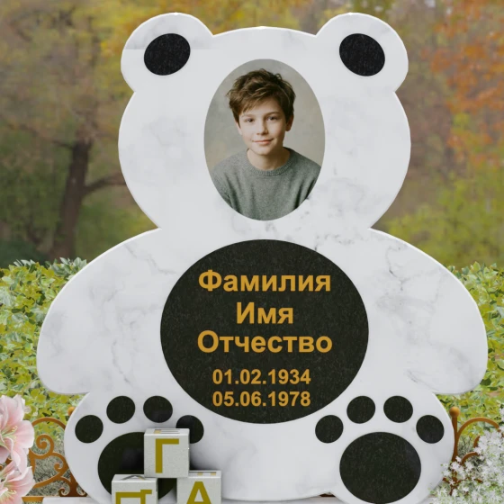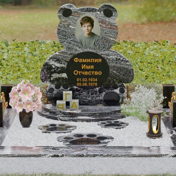 Представленное надгробие из натурального камня (Артикул 235) — это подлинное произведение мемориального искусства, в котором монументальность гранита встречается с трогательной нежностью художественного образа. Силуэт памятника выполнен в форме стилизованной фигуры медвежонка, что мгновенно переводит восприятие из плоскости строгой скорби в область светлых, чистых воспоминаний о невинности и искренности. С точки зрения искусствоведа, выбор такой формы является глубокой аллегорией вечной защиты и неувядающей любви: округлые, мягкие линии стелы лишены острых углов, что символизирует бесконечность и гармонию.