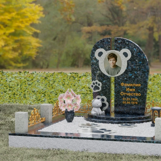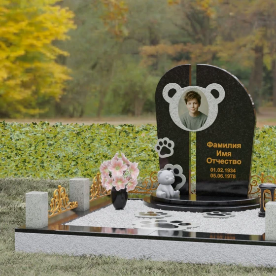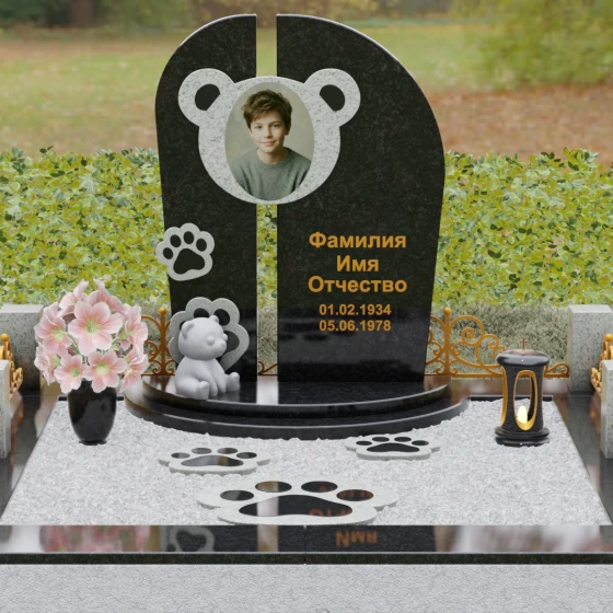 Особое внимание уделено резным элементам: на левой части композиции расположена изящная рельефная лапка, виртуозно вырезанная в камне. Контраст между зеркально отполированной черной поверхностью и светлой, матовой фактурой резных деталей подчеркивает объем и глубину художественного замысла. Завершает ансамбль небольшая объемная скульптура медвежонка, присевшего у подножия мемориала. Его плавные линии и округлые формы вносят в суровую торжественность кладбища нотку домашнего уюта и защиты. Тонкая фаска по краям каждого элемента придает изделию законченный, благородный вид, отражая лучи света и заставляя камень «играть» при любом освещении.