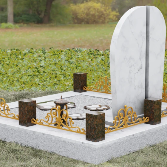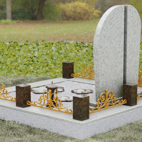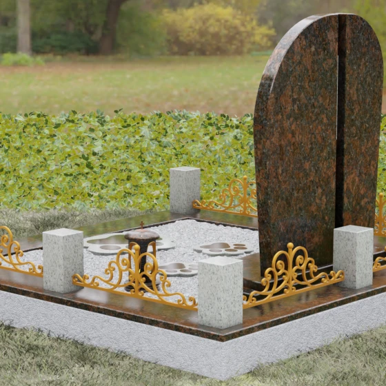 Данная модель предполагает целостное оформление места захоронения, превращая его в гармоничный архитектурный ансамбль. Основанием служит мощный гранитный цоколь, который не только обеспечивает устойчивость всей конструкции, но и четко очерчивает границы участка. По периметру установлены массивные каменные столбики, соединенные декоративным кованым ограждением, что создает атмосферу уединения и защищенности. В едином стиле с основным памятником выполнена надгробная плита и подставка, на которой размещаются дополнительные аксессуары: изящная каменная ваза для живых цветов и закрытая лампада из темного гранита, в которой будет теплиться огонек вечной памяти. Такое решение значительно упрощает уход за участком, сохраняя его аккуратный и достойный вид на долгие годы.