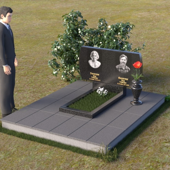 Композиция памятника строится на контрасте строгих геометрических форм и плавных линий, создавая гармоничный и запоминающийся образ. В верхней части возвышается стела из черного гранита, чья зеркальная полировка отражает небо и окружающий мир, словно напоминая о связи земного и небесного. Верхние углы стелы скруглены, смягчая строгость формы и придавая ей более мягкий, человечный облик. На стеле размещены портреты усопших, выполненные с высокой точностью и передающие их индивидуальность. Золотистые надписи имен и дат словно светятся на фоне черного камня, добавляя торжественности и значимости. У подножия стелы располагается горизонтальная плита, также выполненная из полированного черного гранита, создающая ощущение завершенности и устойчивости. Рядом – изящная ваза из того же материала, предназначенная для живых цветов, символа неувядающей памяти и любви.