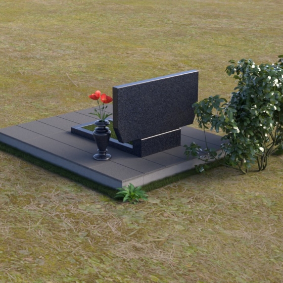 Особое внимание привлекает контраст между полированной поверхностью и матовым срезом камня на боковых гранях. Эта игра фактур создает дополнительный объем и подчеркивает геометрию монумента. Сдержанная, но выразительная форма вазы, выполненная в том же черном граните, гармонично дополняет композицию. Ее плавные линии и классические пропорции создают ощущение умиротворения и покоя.