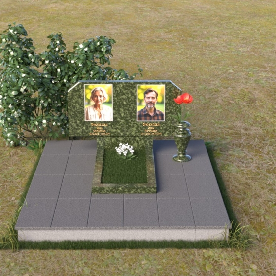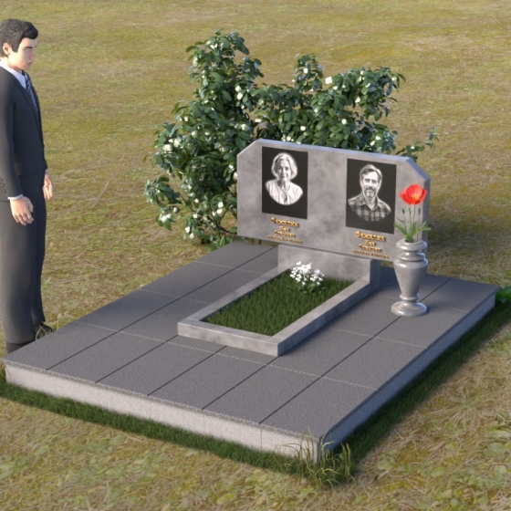 Этот ритуальное изделие (артикул ПГ027) – это не просто надгробный памятник, это способ выразить вашу любовь и уважение к ушедшему близкому человеку. Его строгая, но в то же время элегантная форма, с аккуратно скошенными углами верхней части, символизирует сдержанную скорбь и вечную память. Зеркальная полировка черного камня создает эффект глубины и объема, отражая небо и окружающий мир, словно напоминая о том, что душа усопшего нашла свой покой. Прямоугольная стела, установленная на подставке, выглядит лаконично и достойно. На полированной поверхности отчетливо видны портреты усопших, выгравированные с высокой точностью и детализацией. Композицию завершает ваза из того же материала, в которой можно разместить живые или искусственные цветы, как символ непреходящей любви и памяти. Одинокий красный мак, помещенный в вазу на изображении, служит трогательным акцентом, напоминающим о хрупкости жизни и необходимости ценить каждый момент.