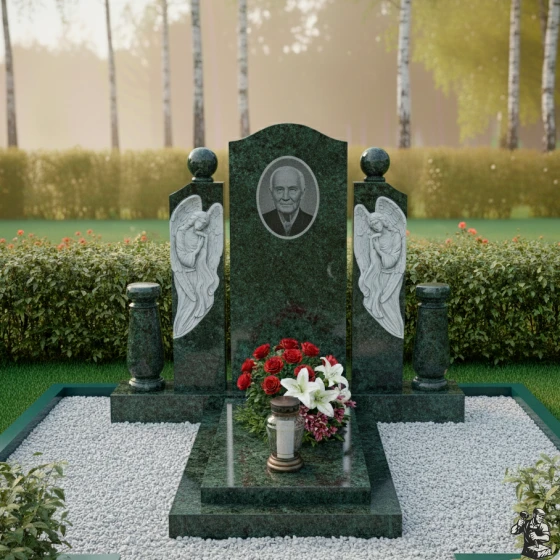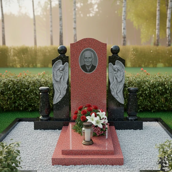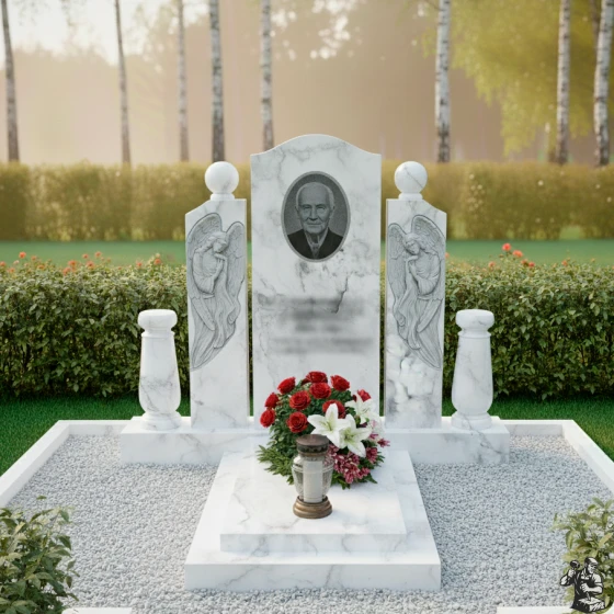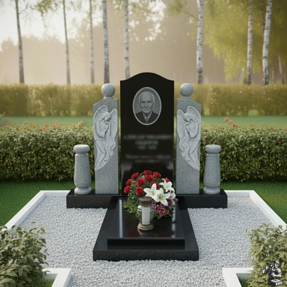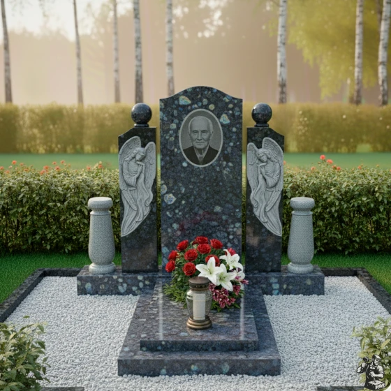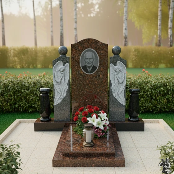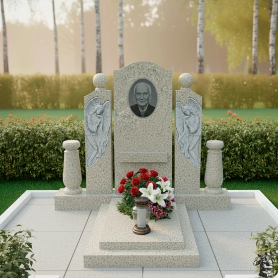 Этот мемориальный комплекс являет собой трогательное сочетание скорби и надежды. Вертикальная стела, обрамленная скульптурами ангелов, словно уносит в мир небесный, где царит покой и умиротворение. Модель доступна в восьми вариантах исполнения, включая семь видов гранита и благородный мрамор Тассос, что позволяет создать памятник, отражающий индивидуальность ушедшего и чувства близких.