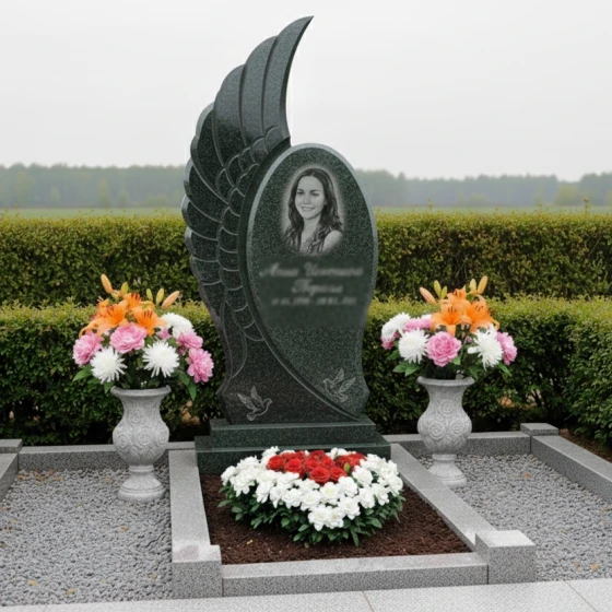 Центральным элементом комплекса является стела, выполненная в уникальной асимметричной форме, напоминающей распахнутое крыло ангела или взлетающую птицу, символизирующую вознесение души и безмятежный покой. Одна сторона стелы имеет строгую вертикальную линию, тогда как другая плавно изгибается вверх, создавая ощущение легкости и устремленности. Эта динамичная форма, лишенная острых углов, передает идею непрерывности жизненного пути и перехода в иное измерение. Грани стелы тщательно отполированы, что придает камню зеркальный блеск и глубину, в то время как внутренняя часть "крыла" украшена объемной резьбой, имитирующей перья. Эта резьба создает игру света и тени, подчеркивая естественную фактуру камня и придавая композиции дополнительный объем и выразительность. На лицевой стороне стелы, в верхней части, выгравирован овальный портрет, обрамленный тонкими линиями, а ниже — информация о покойном, выполненная изящным шрифтом. В нижней части стелы расположена гравировка двух летящих голубей — вечного символа мира, чистоты души и небесного покоя, что еще больше усиливает эмоциональное воздействие мемориала.