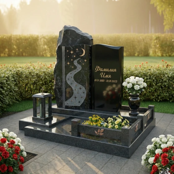 Модель ПН 196 представляет собой двухчастную композицию, где каждая стела обладает своим неповторимым характером. Левая стела, выполненная в виде необработанной скалы, символизирует вечность и незыблемость. Её фактурная поверхность, лишенная зеркальной полировки, создает ощущение первозданной мощи природы. На этой стеле, словно высеченная самой природой, изображена гравировка, стилизованная под ночное небо с извивающейся рекой звезд. Полумесяц и россыпь мерцающих звезд, выполненные с удивительной детализацией, создают эффект глубины и космического спокойствия, а светлая матовая фактура рисунка контрастирует с темным, почти черным полированным фоном, придавая изображению объем и выразительность. Звездная река, плавно уходящая вверх, символизирует путь души к небесам, а звезды напоминают о ярких моментах жизни.