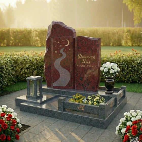 Монумент установлен на массивный, многоуровневый гранитный цоколь, который не только придает всей конструкции исключительную устойчивость, но и формирует завершенную архитектурную композицию. Нижний уровень цоколя имеет широкую, полированную поверхность, создающую ощущение надежности и прочности. Следующий уровень, чуть более узкий, создает эффект ступеней, ведущих к самим стелам. Надгробная плита, выполненная в едином стиле с цоколем и стелами, закрывает всю площадь захоронения, что не только придает участку ухоженный и законченный вид, но и значительно упрощает уход за ним, избавляя от необходимости прополки и поддержания чистоты. По периметру надгробной плиты расположены изящные бортики, образующие две прямоугольные клумбы, предназначенные для живых цветов. В них уже высажены яркие композиции, символизирующие жизнь и память. Дополнительно, в композицию включены элегантная гранитная ваза для цветов, выполненная в той же зеркальной полировке, что и правая стела, и изящный каменный подсвечник-фонарь, который позволяет разместить лампадку, создавая атмосферу уюта и вечной памяти.