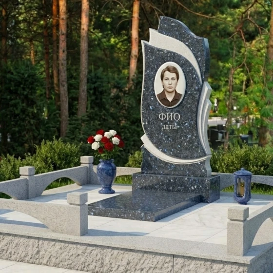 Уникальная форма стелы предоставляет широкие возможности для индивидуального оформления. Портрет усопшего, выполненный методом гравировки или фотокерамики, будет гармонично смотреться в центральной, слегка утопленной части стелы, словно в рамке. Эта конфигурация позволяет максимально выделить изображение, сделав его центром всей композиции. Ниже портрета остается достаточно места для нанесения ФИО и дат жизни, которые будут выглядеть лаконично и читабельно благодаря своей контрастности на идеально отполированной черной поверхности. Мы предлагаем эту мемориальную композицию в 8 цветовых решениях, что позволяет подобрать камень, который наилучшим образом отразит характер и индивидуальность усопшего. Вы можете выбрать один из 7 видов гранита: благородный амфиболит, глубокий Балтик грин, сияющий Блю Перл, классический Габбро-диабаз, теплый Дымовский, насыщенный Лезниковский или светлый Мансуровский. Для ценителей особой эстетики доступен также изысканный мрамор Тассо. Каждый из этих камней обладает своим уникальным рисунком и оттенком, позволяя создать по-настоящему персонализированную композицию.