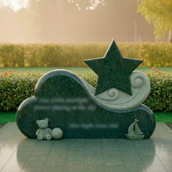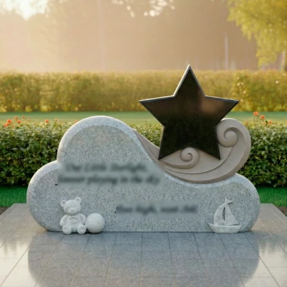 Особое внимание привлекает игра контрастов, мастерски воплощенная в этом монументе. Основная часть, выполненная из глубокого черного гранита, отполирована до зеркального сияния, в котором отражается свет и надежда. На этом фоне выделяется изящный элемент в виде стилизованной звезды, выполненный из светлого мрамора с его неповторимыми прожилками. Звезда, как символ путеводного света и вечной души, поднимается над облаком, указывая на небесный путь. Ее матовая, нежная поверхность создает гармоничный контраст с блестящим черным гранитом, подчеркивая тонкую работу мастера. Вокруг звезды, словно легкий вихрь или нежные волны, вырезаны спиралевидные элементы из того же светлого камня, добавляя композиции динамики и воздушности. В нижней части монумента, на его основании, расположены трогательные резные фигурки: милый плюшевый медвежонок с мячом и изящная лодочка. Эти элементы, выполненные из светлого камня, символизируют невинность детства, мечты и путешествие души, создавая глубоко личный и трогательный образ. Их мягкие, сглаженные формы идеально вписываются в общую концепцию плавности и нежности.