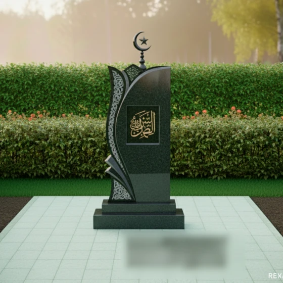Левая сторона стелы украшена объемной резьбой, имитирующей изящный ажурный узор, который словно обнимает основную форму. Этот орнамент, напоминающий восточные мотивы, выполнен в светлом матовом срезе камня, что создает эффектный контраст с глубоким черным цветом полированной поверхности. Замысловатые переплетения линий и завитков вносят в композицию легкость и воздушность, символизируя нежность и утонченность души усопшего. В верхней части стелы возвышается исламский полумесяц со звездой, выполненный из темного металла, что подчеркивает религиозную принадлежность и придает монументу завершенность. В центральной части стелы, в рамке, расположена каллиграфическая надпись, предположительно из Корана, выполненная золотистым цветом, что символизирует духовную ценность и величие.
