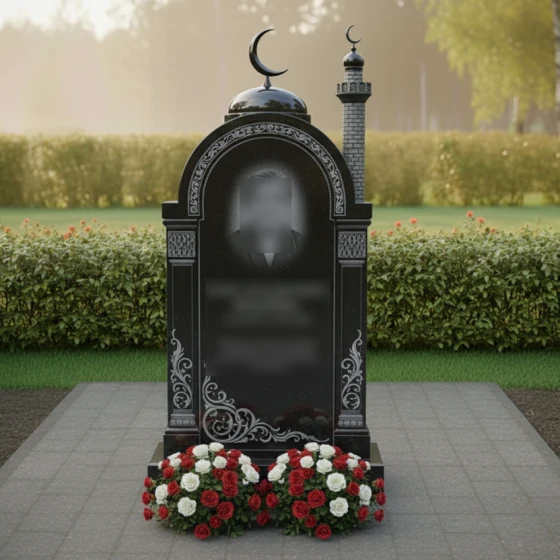 Форма арки в данной композиции глубоко символична: она олицетворяет небесные врата и переход в вечный мир, дарующий душе долгожданный покой. Купол и минарет подчеркивают религиозную принадлежность и духовную крепость веры усопшего. Цветочный орнамент у основания символизирует добрые дела и те ростки светлой памяти, которые остаются в сердцах близких. Это изваяние словно защищает покой близкого человека, создавая вокруг него атмосферу умиротворения и божественной защиты.