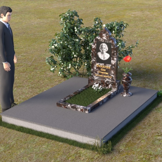 Основание композиции – прямоугольная плита с ровной, матовой поверхностью, обеспечивающая надежную устойчивость всей конструкции. На ней располагается горизонтальная плита, выполненная в виде усеченного параллелепипеда с зеркально отполированной поверхностью. Эта плита создает эффект глубины и отражает окружающий мир, словно запечатлевая моменты жизни ушедшего. Вертикальная стела возвышается над горизонтальной плитой, ее верхняя часть выполнена в форме изящной арки с плавными изгибами. Арка завершается небольшим декоративным элементом, напоминающим купол, что придает памятнику особую выразительность и духовность.
