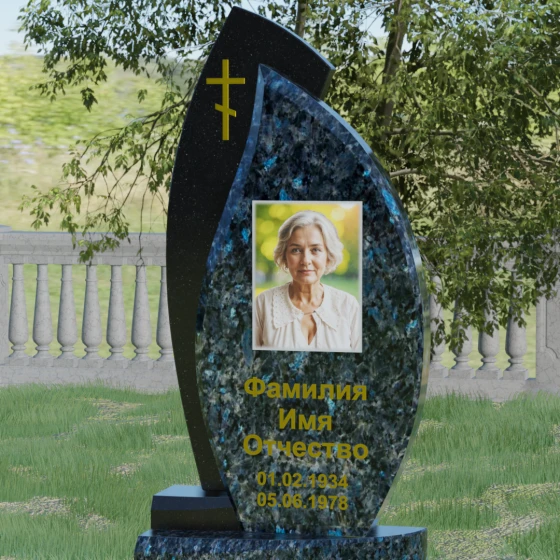 Геометрия модели выстроена на сочетании двух различных пород камня, что позволяет добиться уникальной глубины восприятия. Мы предлагаем этот проект в 8 цветовых вариациях, используя лучшие сорта природного материала: величественный гранит амфиболит, изысканный Балтик грин, мерцающий Блю Перл, классический Габбро-диабаз, насыщенный Дымовский, яркий Лезниковский, светлый Мансуровский или белоснежный мрамор Тассо. Такое разнообразие палитры — это не просто эстетический выбор, а возможность отразить уникальный характер и темперамент покойного, подобрав камень, который будет резонировать с его жизненным путем.