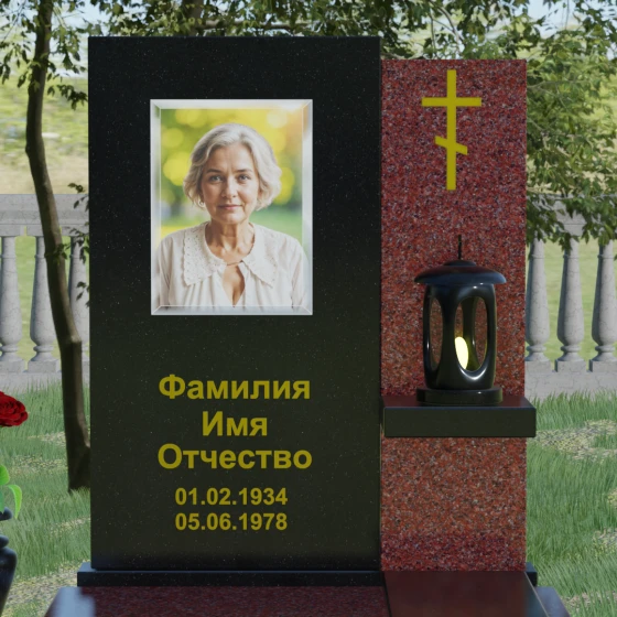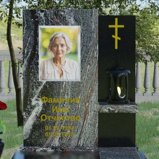 Представленная модель отличается изысканной асимметрией и сложной геометрией, где две вертикальные стелы разной высоты сливаются в единый гармоничный ансамбль. Левая часть, более высокая и массивная, имеет плавный дугообразный срез в верхней части. Этот мягкий изгиб символизирует бесконечность жизненного пути и обретенный вечный покой, смягчая строгость натурального камня. На этой панели располагается портрет и основная информация, выполненная глубокой гравировкой с золочением. Правая часть композиции, выполненная из контрастного камня, служит духовным акцентом: на ней закреплен лаконичный православный крест, сияющий золотом, что подчеркивает веру и надежду на вечную жизнь.