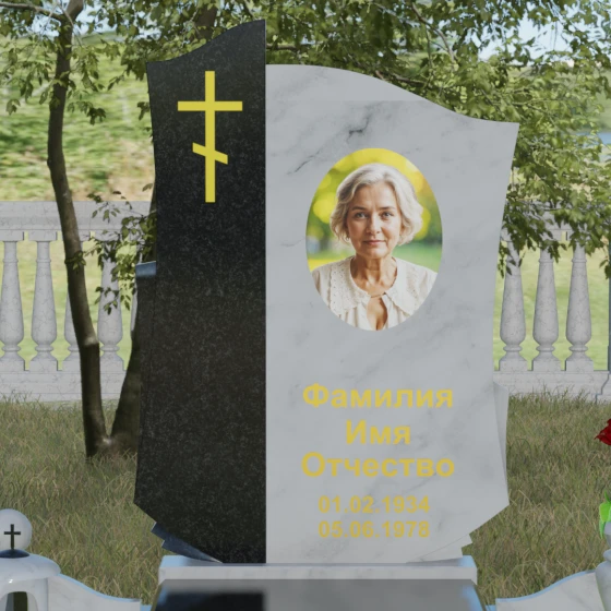 Форма стелы, сочетающая в себе прямые линии основания и волнообразный верх, символизирует земной путь, переходящий в бесконечность. Плавная волна отождествляется с чистотой помыслов и спокойствием, которое обретает душа. Вертикальный элемент с крестом выступает в роли духовного оберега, символизируя непоколебимую веру и защиту. Использование двух контрастных видов камня (светлого и темного) олицетворяет единство противоположностей: светлой памяти и земной печали, временного бытия и вечной жизни.