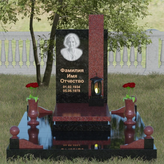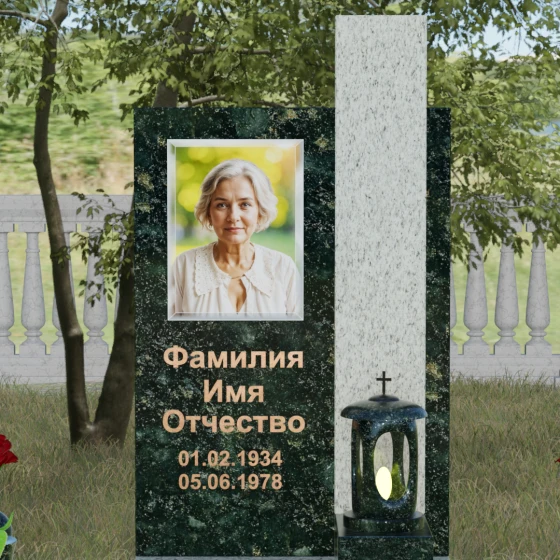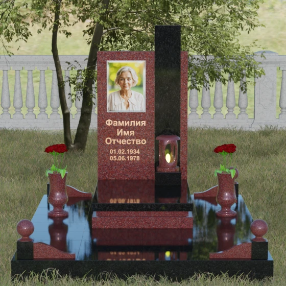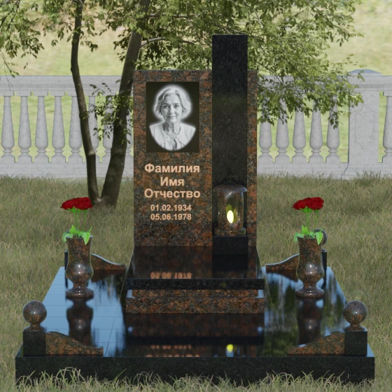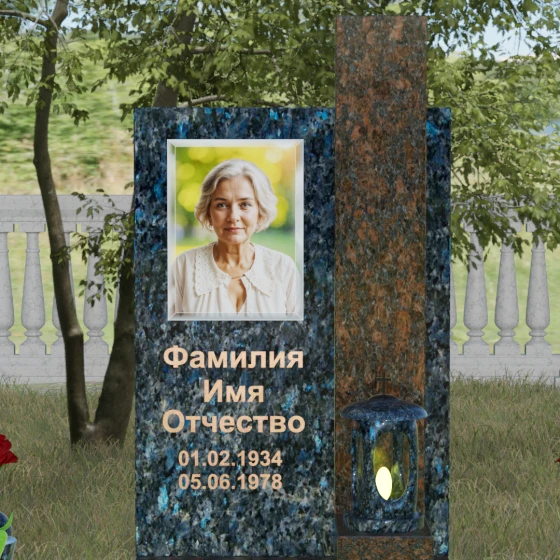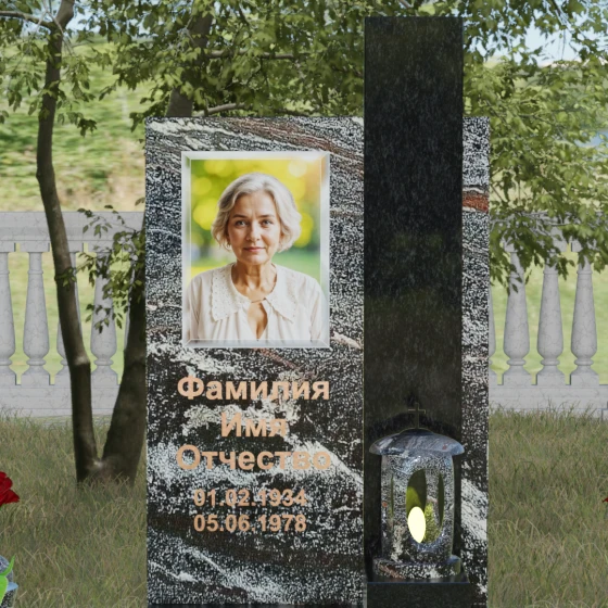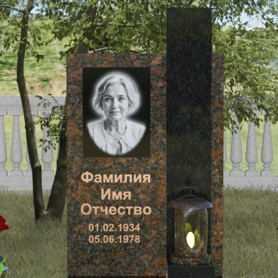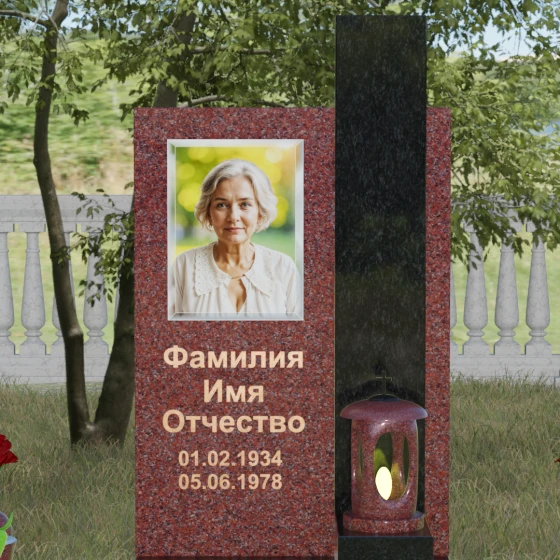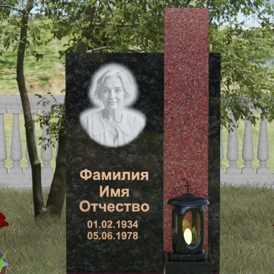 Геометрия изделия строгая: идеально ровные грани и четкие углы подчеркивают фундаментальность конструкции. Особое внимание уделено игре контрастов. Зеркальная полировка основной плиты, обладающая глубоким блеском, эффектно соседствует с цветной вставкой из гранита другого оттенка. Этот визуальный разрыв не только придает памятнику объем, но и позволяет расставить смысловые акценты, выделяя зону эпитафии и портрета. Завершает композицию интегрированная в основание каменная лампада, установленная на специальный выступающий постамент, что превращает стелу в полноценный ритуальный алтарь.