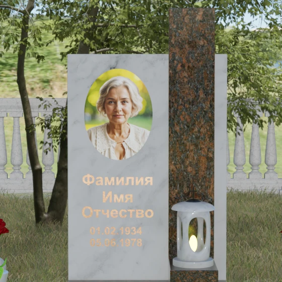 Оформление: Для данной модели архитекторы рекомендуют использовать сочетание различных техник нанесения информации. Портрет может быть выполнен в виде классической гравировки с глубокой прорисовкой деталей или в форме современной фотокерамики в нише. Для ФИО идеально подойдет накладной бронзовый шрифт или глубокая пескоструйная резка с покрытием «сусальное золото» — это подчеркнет статусность мемориала и обеспечит читаемость надписей даже в пасмурную погоду.