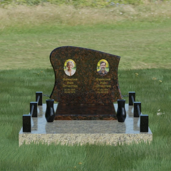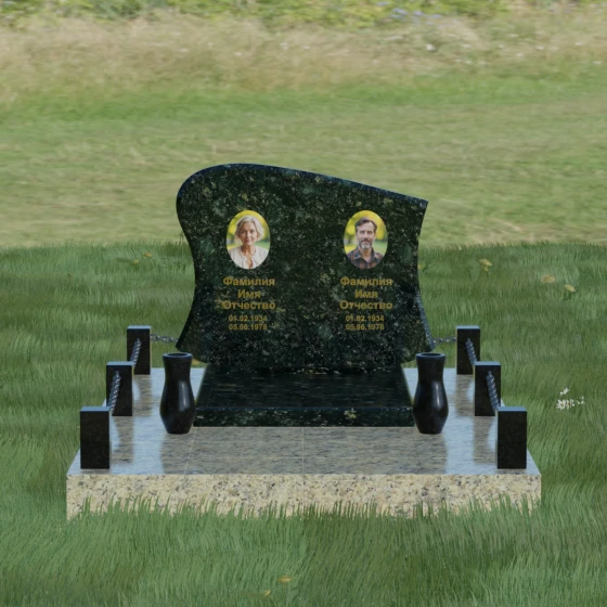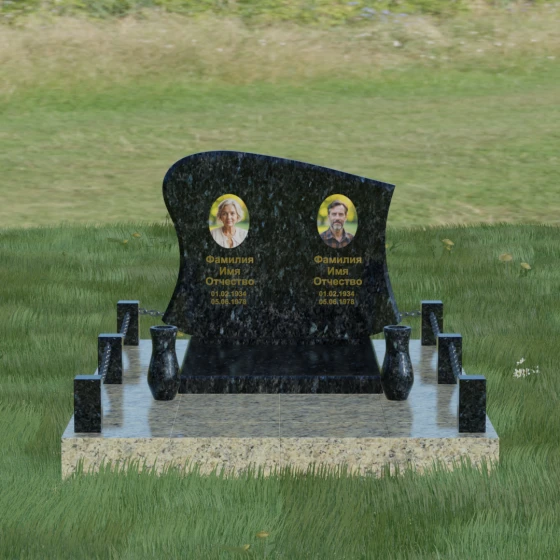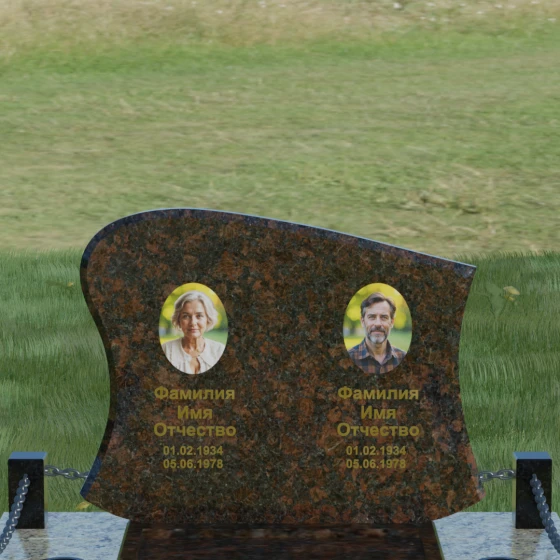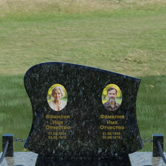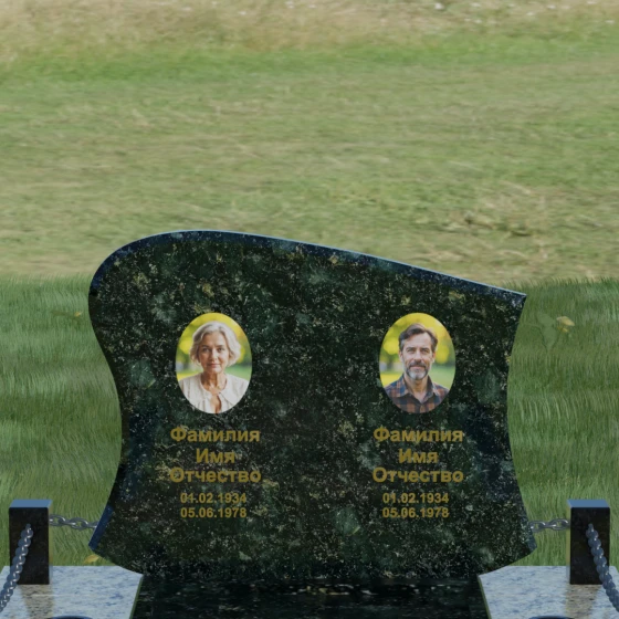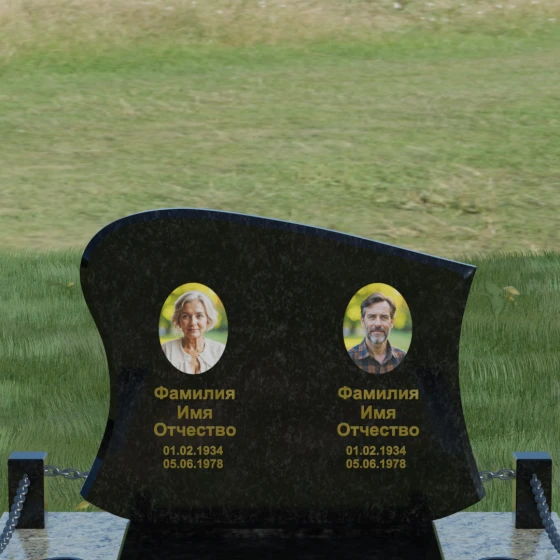 Оформление: Для стелы такой горизонтальной формы идеальным решением станет использование овальных керамических или стеклянных портретов, расположенных симметрично. Рекомендуется использовать гравировку ФИО с покрытием «сусальное золото» или бронзовой краской. Это создаст необходимый акцент на темном фоне камня и позволит надписям оставаться четкими и читаемыми даже в пасмурную погоду. Между портретами достаточно свободного места для нанесения небольшой эпитафии или памятного символа, например, гравировки ветви плакучей ивы или березы.