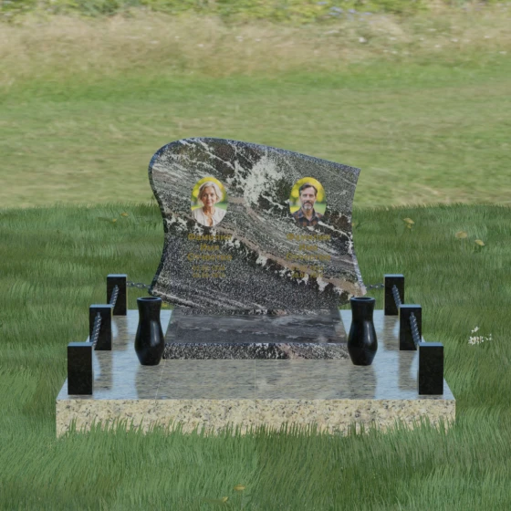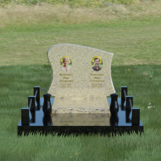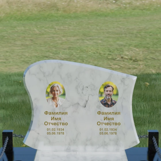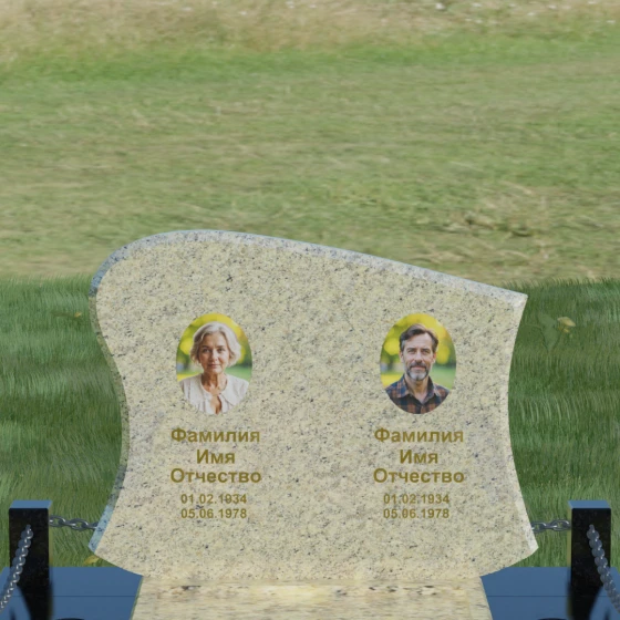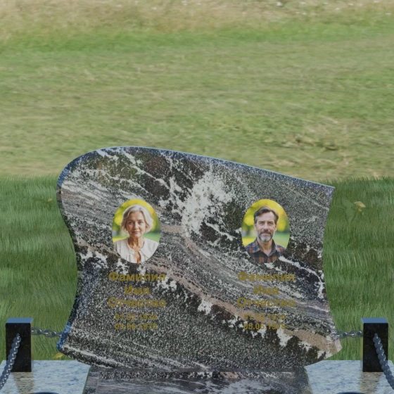 Данное ритуальное изделие представляет собой образец современного мемориального искусства, где строгость камня гармонично сочетается с мягкостью линий. Горизонтальная стела рассчитана на парное захоронение, что символизирует неразрывную связь двух близких людей. Главной особенностью формы является асимметричный верхний край, выполненный в виде плавной, набегающей волны. Левый край композиции возвышается мягким куполом, плавно переходя в изящный изгиб, который завершается чуть ниже с правой стороны. Такая геометрия лишена острых, агрессивных углов, что придает всей конструкции вид спокойного и благородного умиротворения.