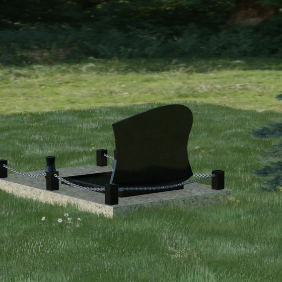 Комплексная организация участка выполнена в едином стилистическом ключе. Вместо стандартного открытого цветника здесь используется сплошная надгробная плита. Это решение не только придает захоронению законченный и эстетичный вид, но и значительно упрощает уход за участком, предотвращая рост сорной травы и скопление лишней влаги. По периметру установлена массивная гранитная ограда, состоящая из полированных столбиков и декоративных металлических цепей. Такое ограждение четко очерчивает границы сакрального пространства, сохраняя при этом ощущение открытости и легкости всей композиции.