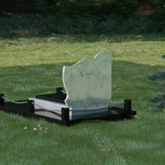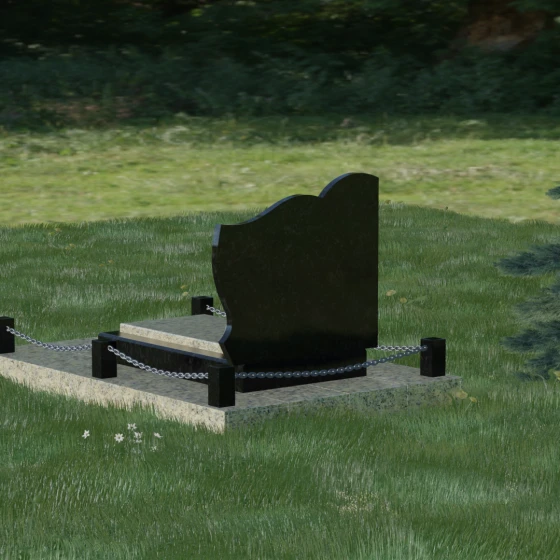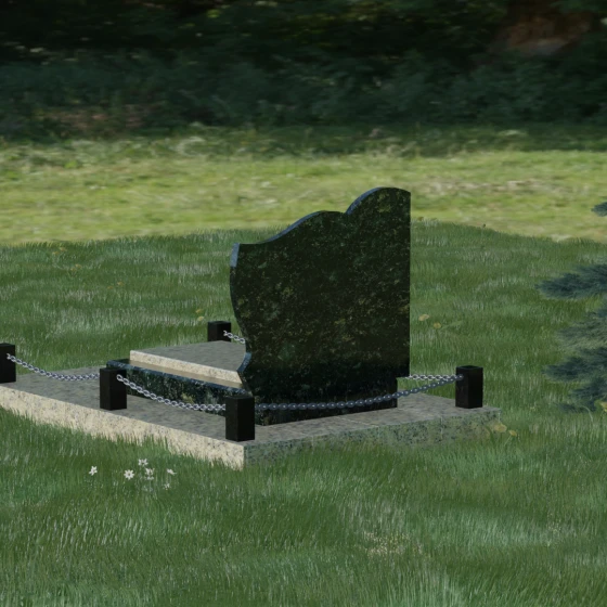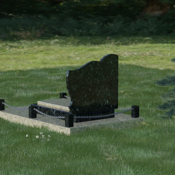 Особое внимание уделено благоустройству прилегающей территории, которое превращает стелу в законченный архитектурный комплекс. Основание монумента установлено на массивный гранитный цоколь, обеспечивающий безупречную устойчивость всей конструкции. Периметр участка обозначен строгими каменными столбиками, соединенными декоративными цепями, что создает четкие границы сакрального пространства. Центральная часть оформлена комбинированной надгробной плитой: сочетание различных фактур и оттенков камня не только придает эстетическую глубину, но и обеспечивает максимальную практичность. Полное мощение участка исключает необходимость борьбы с сорняками, сохраняя аккуратный и торжественный вид на десятилетия без частого вмешательства со стороны человека.