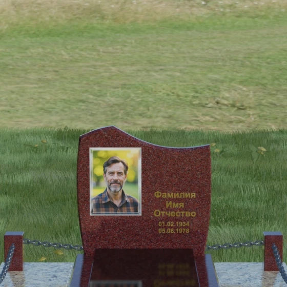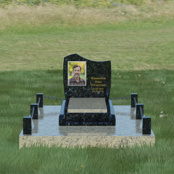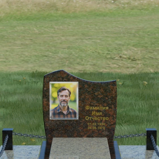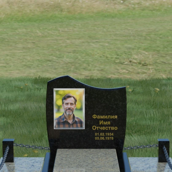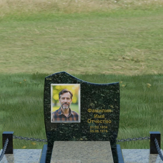 Зеркальная полировка лицевой стороны позволяет добиться глубокого, насыщенного цвета, на фоне которого особенно эффектно смотрятся элементы оформления. Портрет, выполненный на высококачественной керамике, обрамлен лаконичной рамкой, а золочение букв придает мемориалу торжественный и благородный вид. Тщательная проработка каждого элемента — от идеально ровных торцов до бесшовного соединения с постаментом — свидетельствует о высочайшем уровне камнерезного искусства.