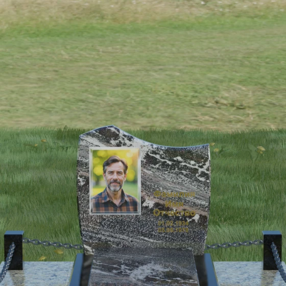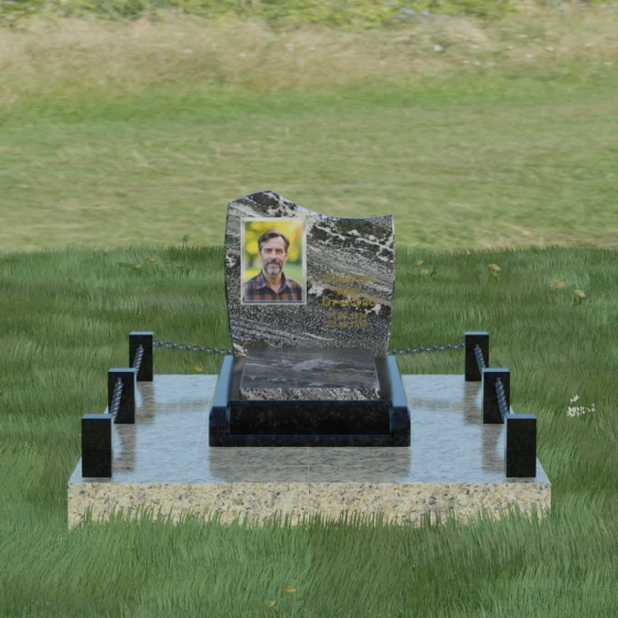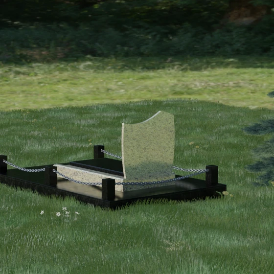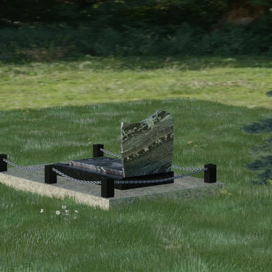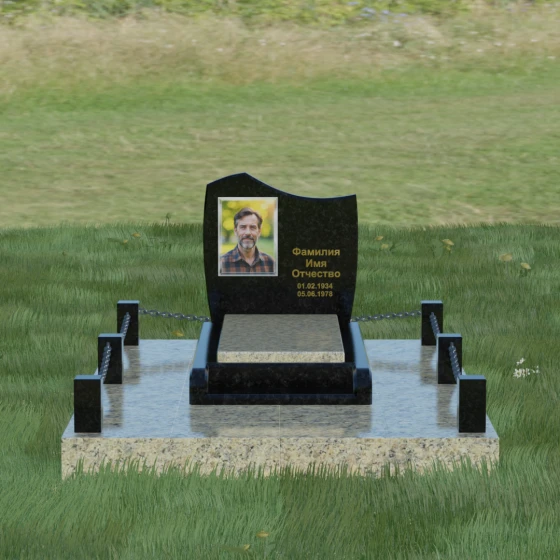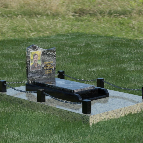 Форма волны на вершине памятника традиционно ассоциируется с течением времени и покоем. В то же время строгий вертикальный акцент слева подчеркивает стойкость характера и волевые качества личности. Благоустройство участка выполнено в едином стиле, превращая место захоронения в полноценный мемориальный комплекс. Вместо открытого грунта используется сплошная надгробная плита, состоящая из комбинированных сегментов. Центральная часть плиты выполнена из камня с выраженной зернистой фактурой, что создает изысканную игру контрастов с глубоким черным цветом окантовки.
