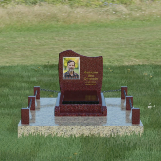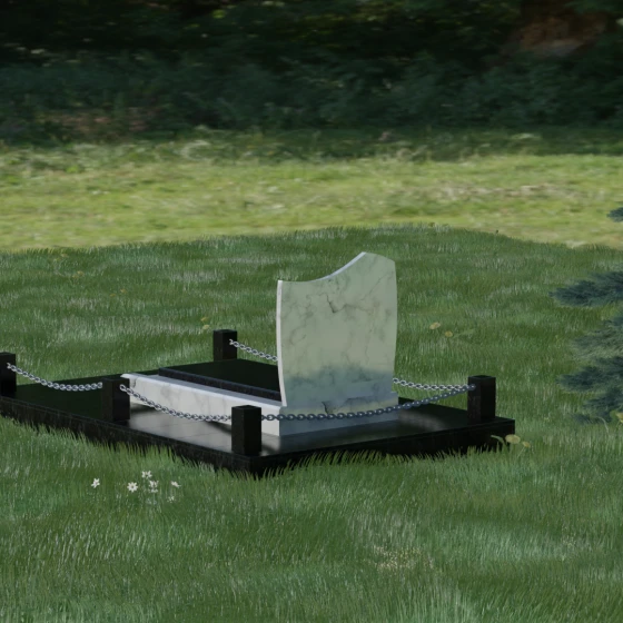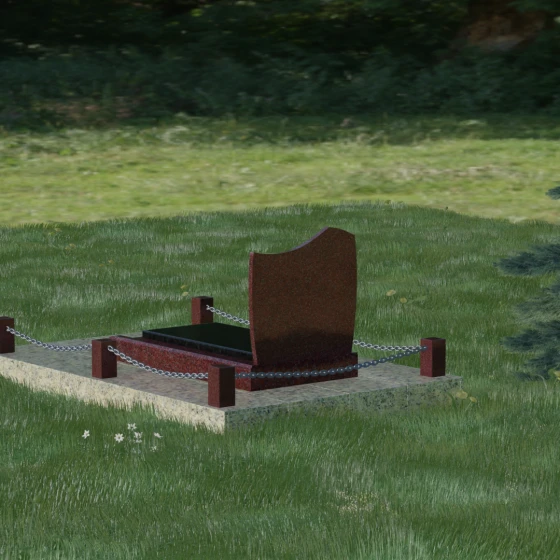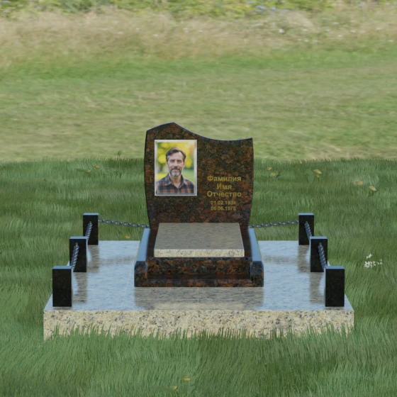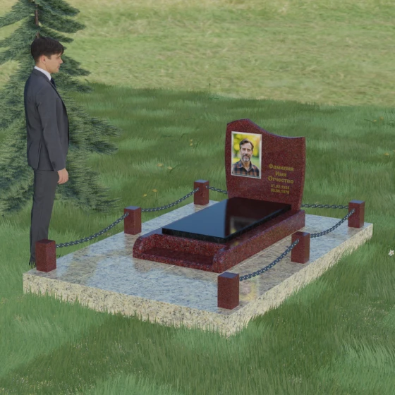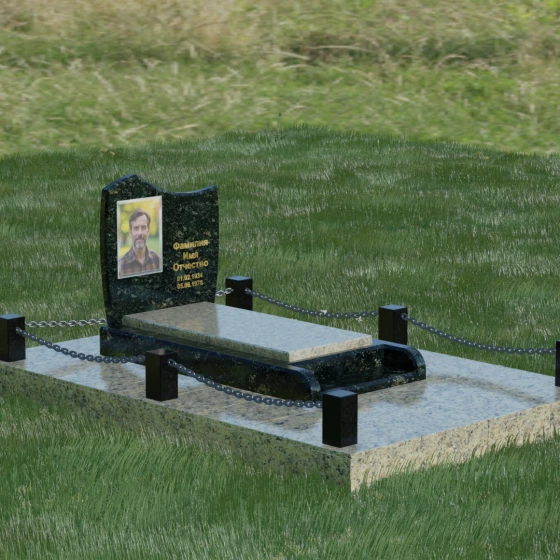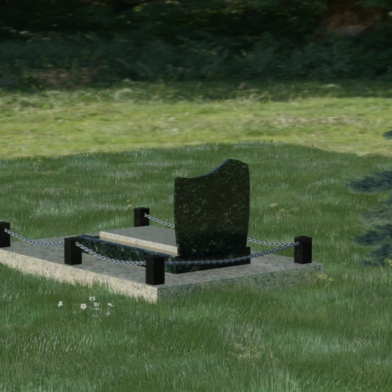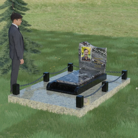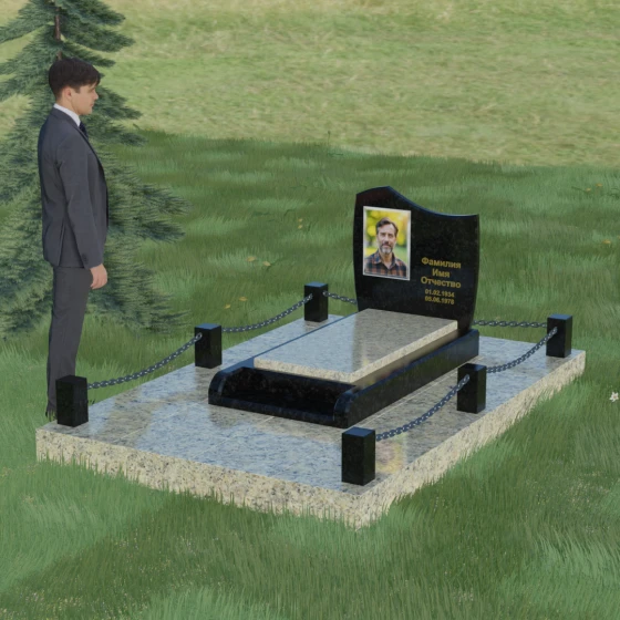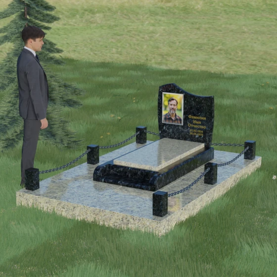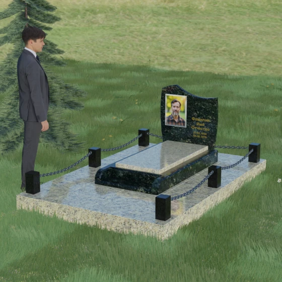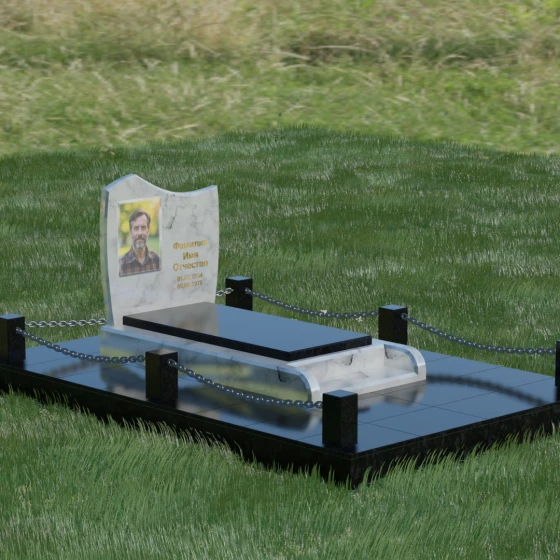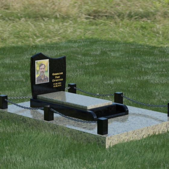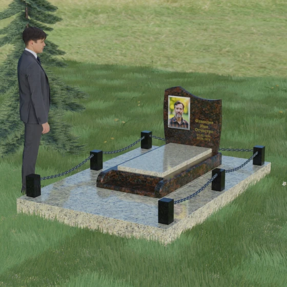 Особое внимание уделено периметру: массивный гранитный цоколь обеспечивает устойчивость всей конструкции, а декоративные каменные столбики, соединенные тяжелыми металлическими цепями, создают визуальную и физическую границу сакрального пространства. Такое решение не только придает мемориалу завершенный, монументальный вид, но и значительно упрощает уход за участком, сохраняя его первозданную чистоту на десятилетия.