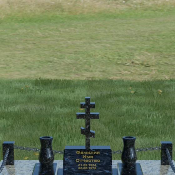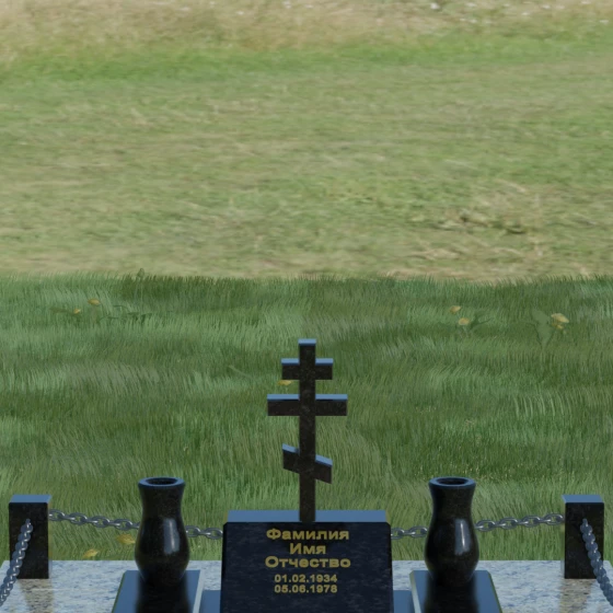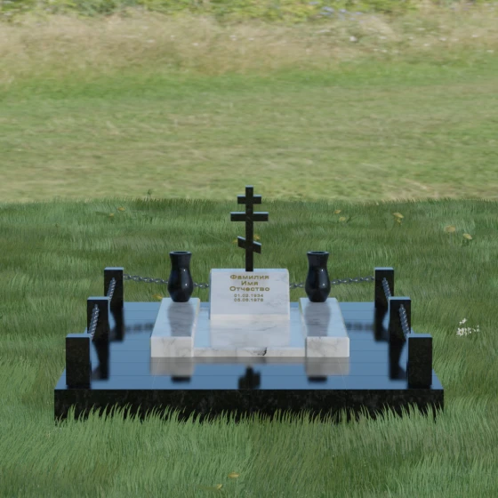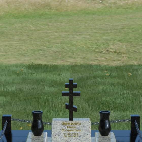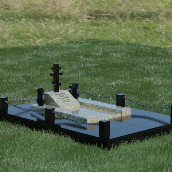 Особого внимания заслуживает художественная игра контрастов, реализованная в этой модели. Основная плита и декоративные элементы выполнены из глубокого черного камня с зеркальной полировкой, которая отражает окружающий мир, создавая эффект глубины. Стела имеет горизонтальную ориентацию, что позволяет разместить информацию максимально лаконично и читаемо. По обе стороны от центральной части расположены две изящные гранитные вазы, чьи плавные, точеные формы смягчают строгость прямых углов. Завершенность мемориальному комплексу придает массивное основание — надгробная плита, выполненная из гранита контрастного светлого оттенка. Такое решение не только эстетично, но и максимально практично: сплошное мощение участка полностью исключает рост сорной травы и необходимость сложного ухода за грунтом, сохраняя безупречный вид захоронения на десятилетия.