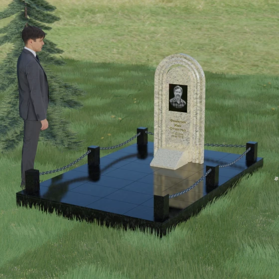 Эстетика этой модели строится на безупречной зеркальной полировке. Глубокий блеск камня отражает мир вокруг, визуально расширяя пространство и создавая игру света на изогнутых поверхностях. Особое внимание уделено благоустройству прилегающей территории: мемориал установлен на сплошную полированную плиту, полностью закрывающую участок. Это не только создает законченный и «дорогой» вид всей композиции, но и несет практическую пользу, исключая прорастание сорной травы и упрощая уход за местом памяти. По периметру установлены строгие квадратные столбики из натурального камня, соединенные массивными декоративными цепями. Такая ограда обозначает границы сакрального пространства, подчеркивая его обособленность и неприкосновенность, при этом не создавая ощущения тяжелой замкнутости.