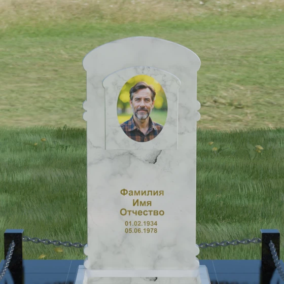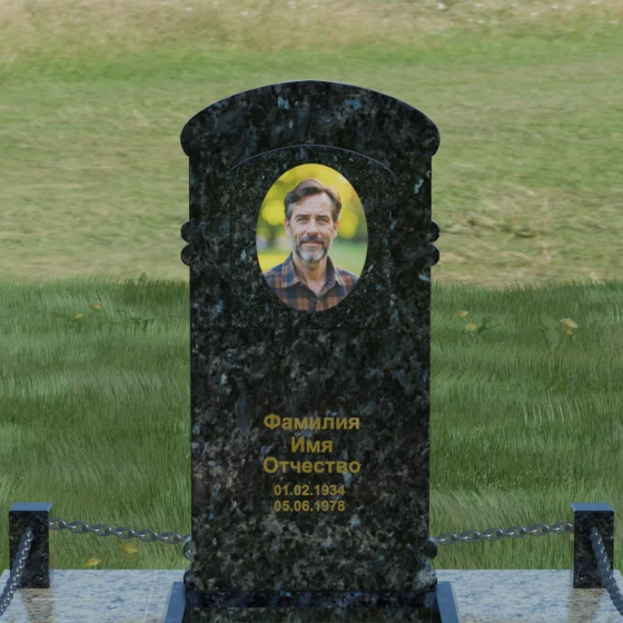 Представленная мемориальная композиция — это воплощение архитектурного баланса, где строгость классических форм встречается с мягкостью художественных линий. В центре ансамбля находится вертикальная стела с уникальной геометрией: её верхняя грань образует пологую, торжественную арку, которая плавно переходит в декоративные выступы на боковых гранях. Особенностью модели является глубокая резная ниша в форме идеального овала, создающая естественное обрамление для портрета. Внутренняя дуга, вырезанная в теле камня над портретной зоной, имитирует свод священной арки, придавая изделию объем и глубину. Зеркальная полировка основной плоскости создает глубокий, почти мистический блеск, в котором отражается небо, подчеркивая монументальность и чистоту исполнения каждой детали.