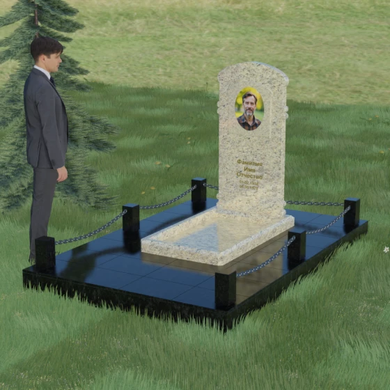 Благоустройство участка продумано до мелочей и формирует законченное сакральное пространство. Основание мемориала установлено на массивный гранитный цоколь, который служит надежным фундаментом и защищает конструкцию от сезонных изменений почвы. Территория полностью облицована широкоформатными полированными плитами — такое решение не только придает эстетическую завершенность, но и гарантирует безупречный вид участка на десятилетия, сводя уход за ним к минимуму. По периметру установлены строгие квадратные столбики из камня, соединенные декоративными цепями. Эта деталь визуально очерчивает границы личного пространства, создавая атмосферу уединения и покоя, отделяя место памяти от остального мира.