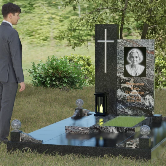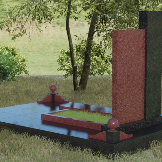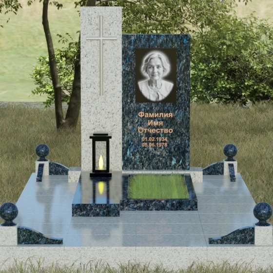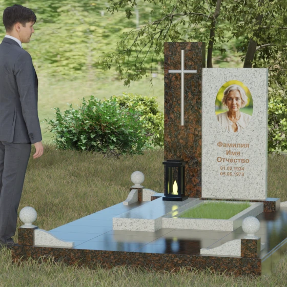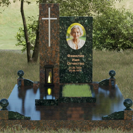 Центральным элементом выступает вертикальная стела, состоящая из двух контрастных блоков, символизирующих дуальность бытия. Левая часть композиции выполнена в виде высокого узкого пилона из насыщенного цветного гранита. На его фронтальной стороне закреплен лаконичный четырехконечный крест с благородным металлическим напылением. Отсутствие лишнего декора на кресте подчеркивает торжественность и строгость момента. Правое крыло стелы — более широкое и основательное — служит идеальным полотном для нанесения портрета и эпитафии. Контраст между глубоким темным оттенком основной плиты и ярким акцентом левой части создает динамику, притягивающую взгляд, но сохраняющую общее настроение светлой грусти.