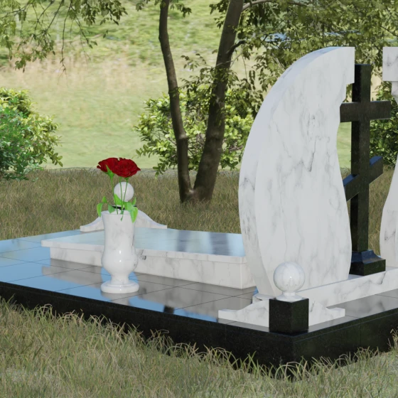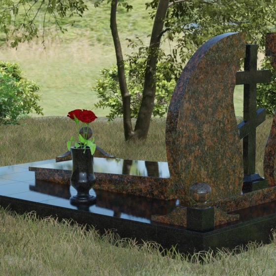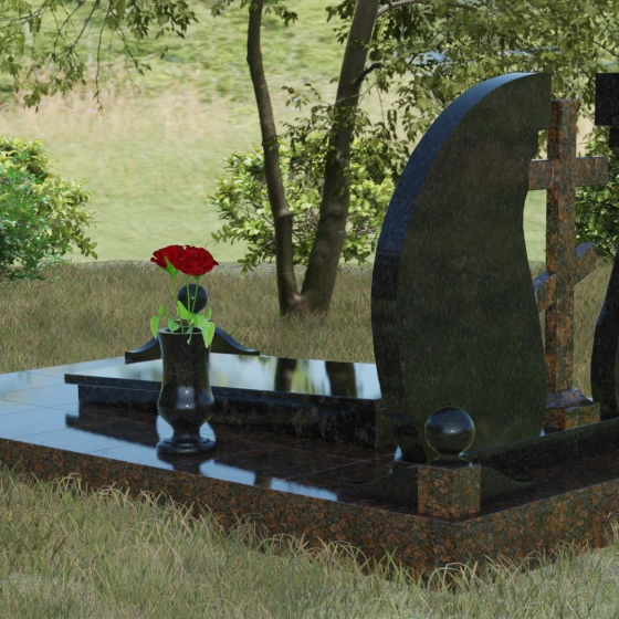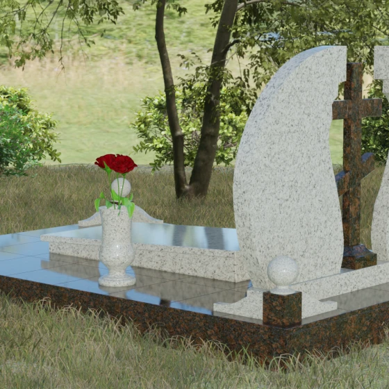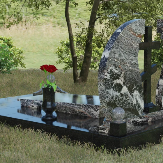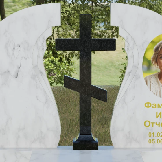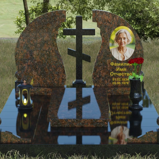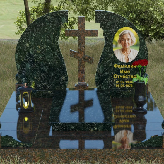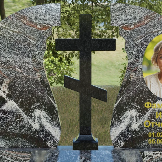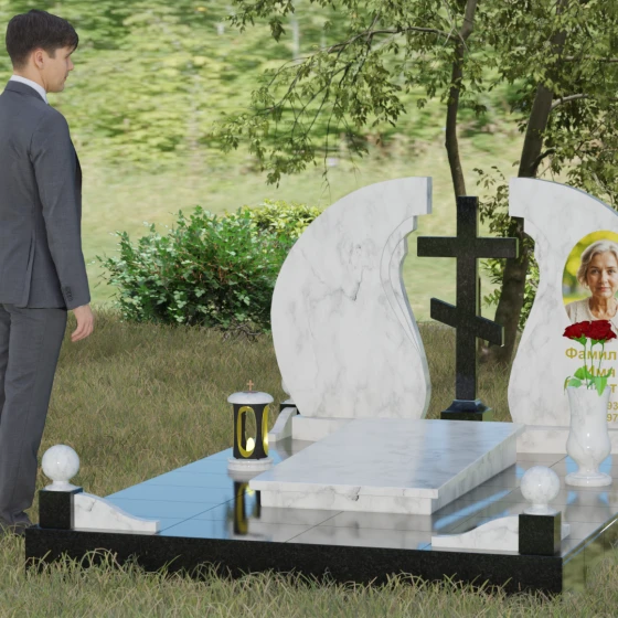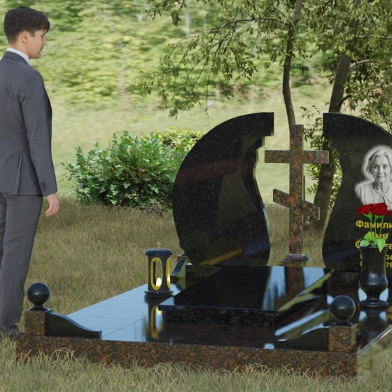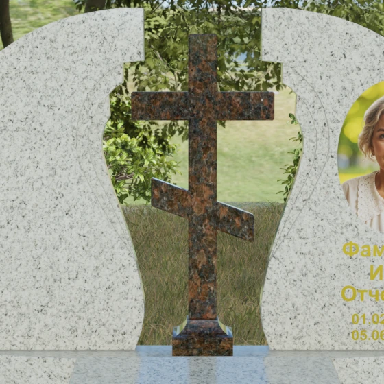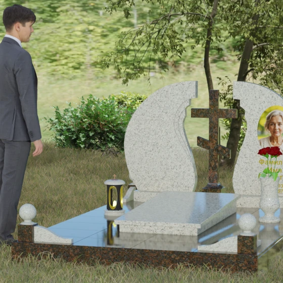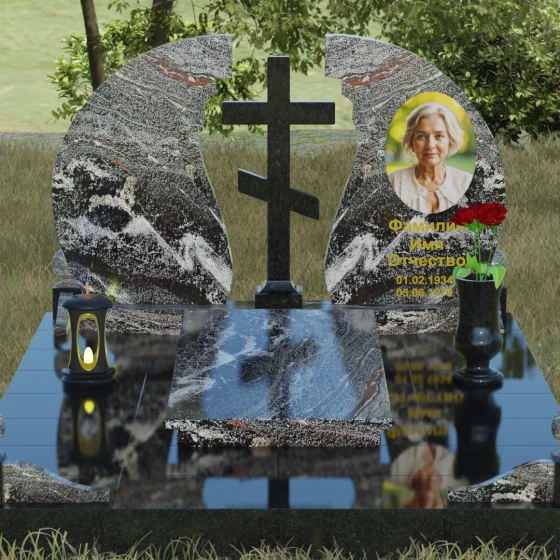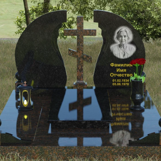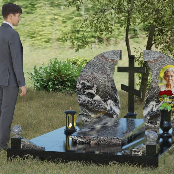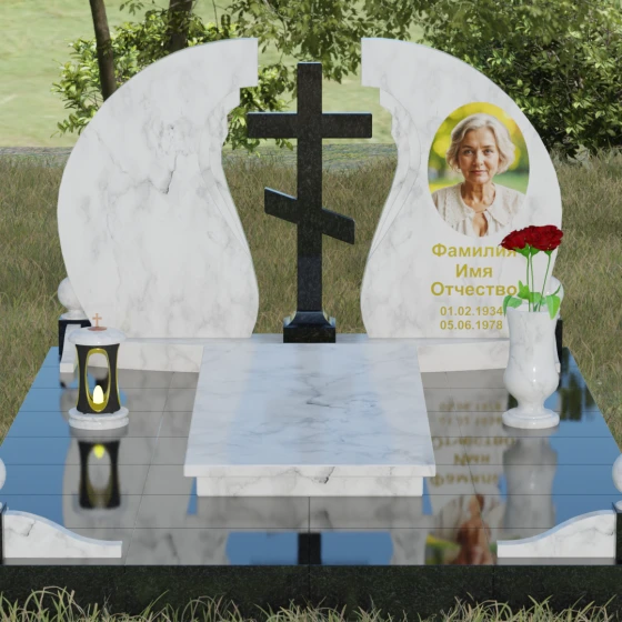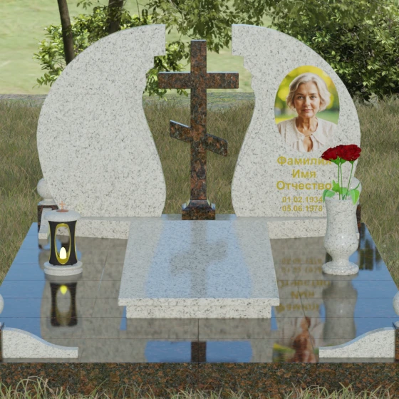 Мемориальный ансамбль (Артикул 066) — это не просто памятный знак, а глубоко продуманная художественная композиция, символизирующая вечный покой и небесное покровительство. Центром этого изысканного ансамбля является величественная стела, состоящая из двух симметричных полотен. Грация форм здесь сочетается с глубоким символизмом: плавные, волнообразные изгибы внутренних граней камня напоминают крылья ангела или раскрытую книгу жизни. Между двумя частями композиции возвышается восьмиконечный православный крест, выполненный из контрастного камня, что акцентирует внимание на духовной составляющей и непоколебимой вере.