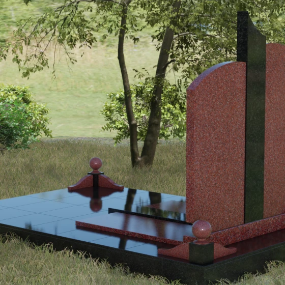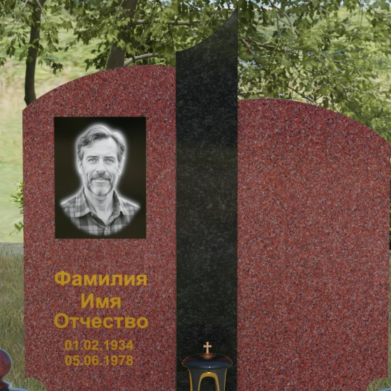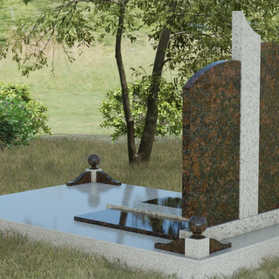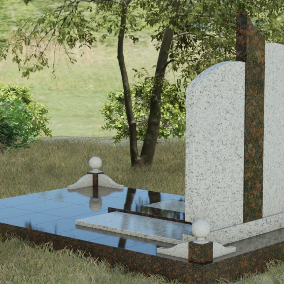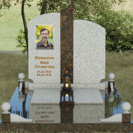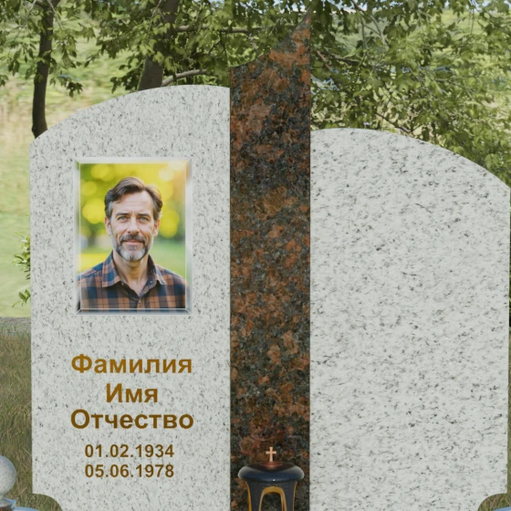 Гранитный монумент артикула 068 представляет собой гармоничную архитектурную композицию, которая выделяется на фоне традиционных решений своей благородной асимметрией и сложной игрой фактур. В основе дизайна лежит сочетание двух контрастных видов камня, разделенных изящной вертикальной вставкой. Основные элементы мемориала имеют мягкие, дугообразные завершения, напоминающие своды храма или спокойные изгибы горизонта. Такое решение лишает памятник излишней суровости, привнося в облик места захоронения чувство умиротворения и светлой печали. Особое внимание привлекает центральный декоративный элемент: узкая колонна из текстурного гранита с рваной или полированной поверхностью служит смысловым акцентом, соединяющим две части надгробия в единый ансамбль.