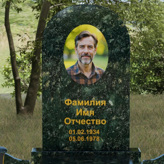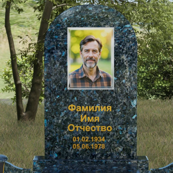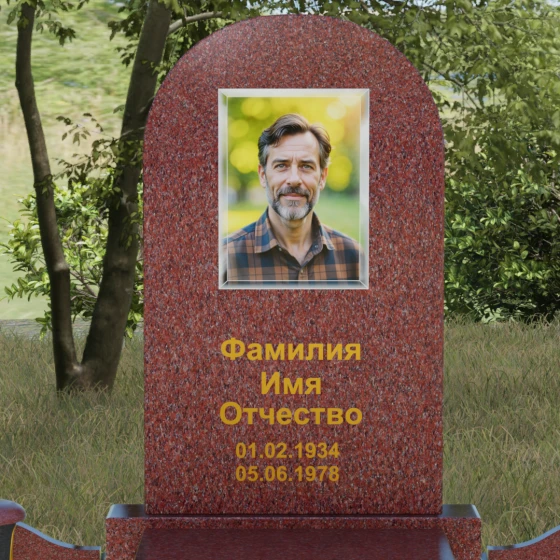Геометрия арочного свода идеально подходит для центрированного расположения портрета. Будь то классическая лазерная гравировка с высокой детализацией или современный фотокерамический медальон, форма арки естественным образом обрамляет лик, концентрируя на нем внимание. Просторная поверхность позволяет гармонично разместить не только фамилию и даты, но и эпитафию или дополнительные художественные элементы. На представленных образцах мы видим, как эффектно смотрится золочение букв на темном фоне, добавляя мемориалу торжественности и статусности.