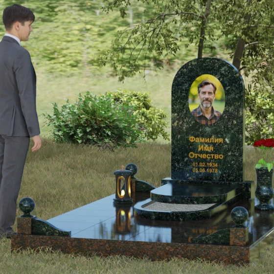 Особое внимание привлекает игра фактур и объемов. Зеркальная полировка центрального обелиска создает эффект глубины, в которой отражается окружающее пространство, делая памятник живым и изменчивым. Благоустройство участка выполнено по европейскому стандарту: вся территория мемориала вымощена строгой гранитной плиткой, что не только придает эстетическую завершенность, но и гарантирует безупречный вид участка на десятилетия, избавляя от необходимости борьбы с сорняками. Периметр обозначен элегантным цоколем с акцентными столбиками, увенчанными идеальными каменными сферами. Эти шары расставляют четкие визуальные акценты, превращая место захоронения в полноценный архитектурный объект.