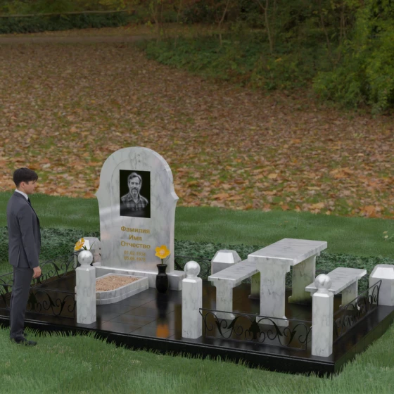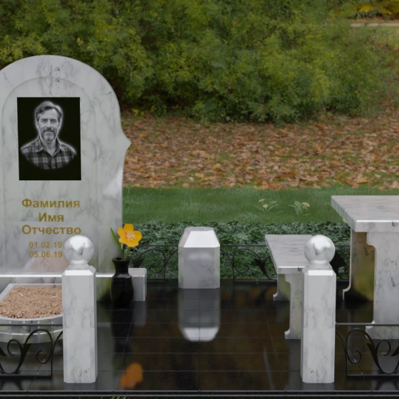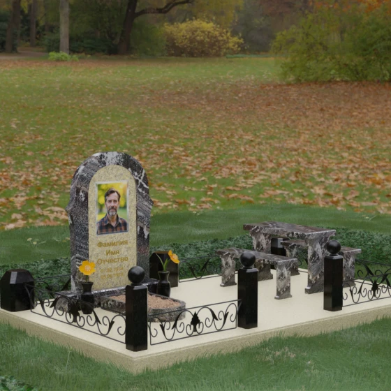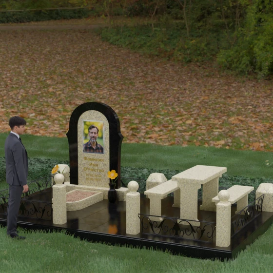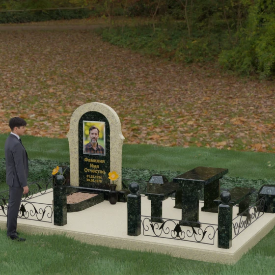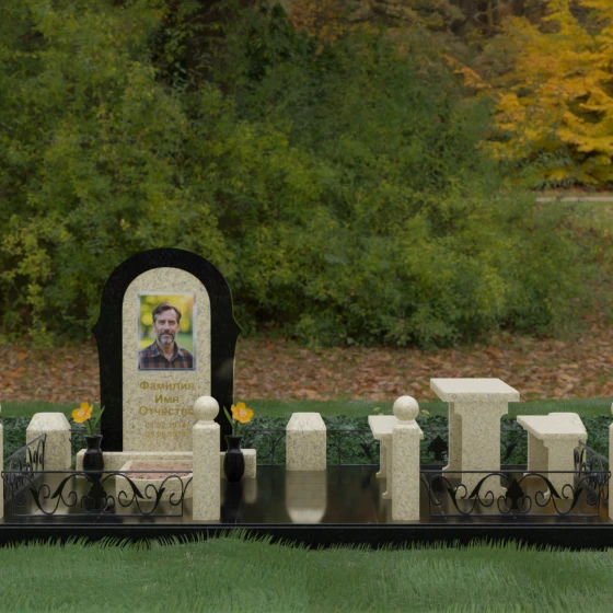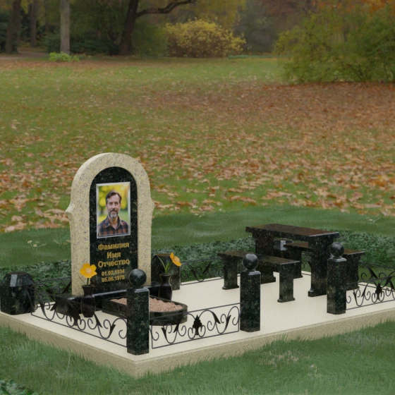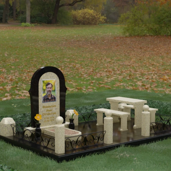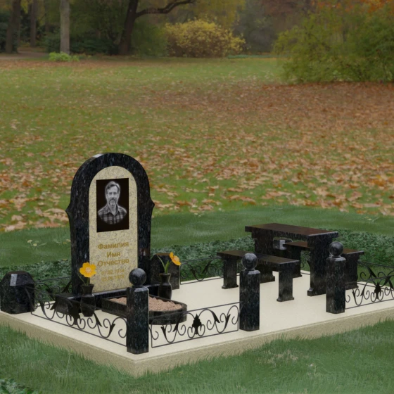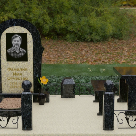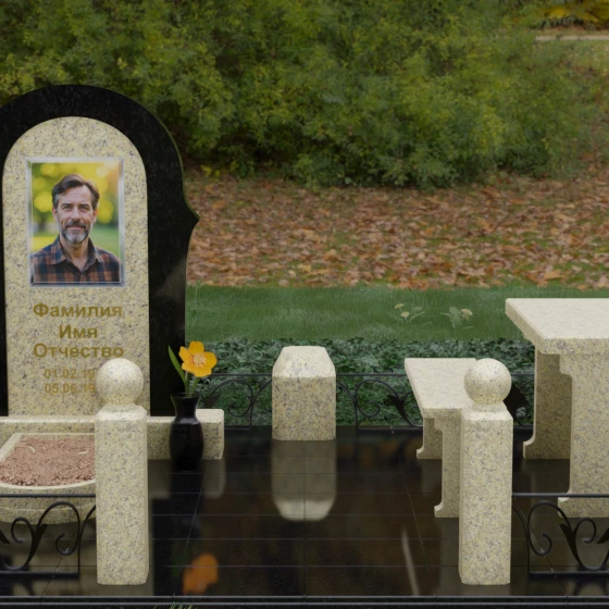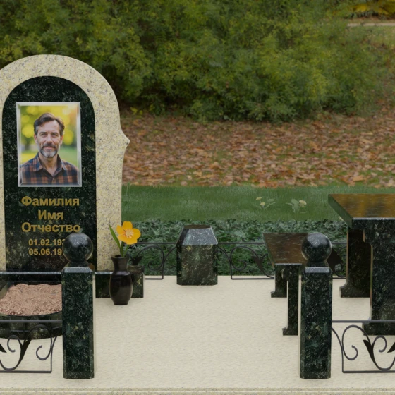 Фактурное исполнение монумента строится на игре контрастов. Зеркальная, глубокая полировка темного гранита, в которой отражается окружающий мир, соседствует со светлыми матовыми элементами обрамления. Идеально ровные поверхности свидетельствуют о высочайшем качестве обработки камня: каждая грань доведена до совершенства, что обеспечивает не только визуальный магнетизм, но и долговечность. Благоустройство участка выполнено в едином ансамбле: вместо открытого грунта используется полное мощение плитами из натурального камня, что придает месту захоронения завершенный, благородный вид и значительно упрощает уход. Периметр обозначен строгим цоколем с массивными столбиками, увенчанными каменными шарами — символами гармонии и завершенности жизненного пути. В состав композиции также входят лаконичный стол и скамьи на фигурных ножках, создающие пространство для уединенного общения с душой ушедшего.