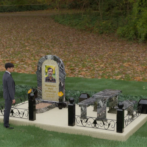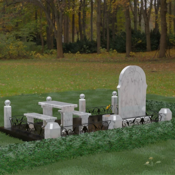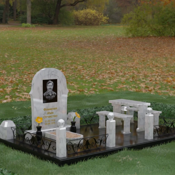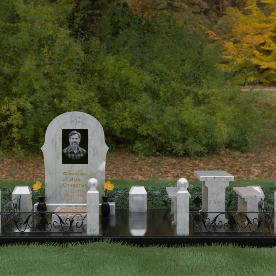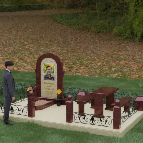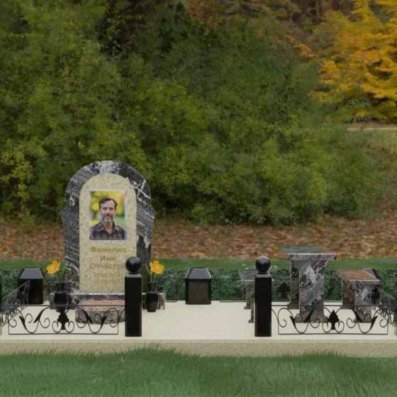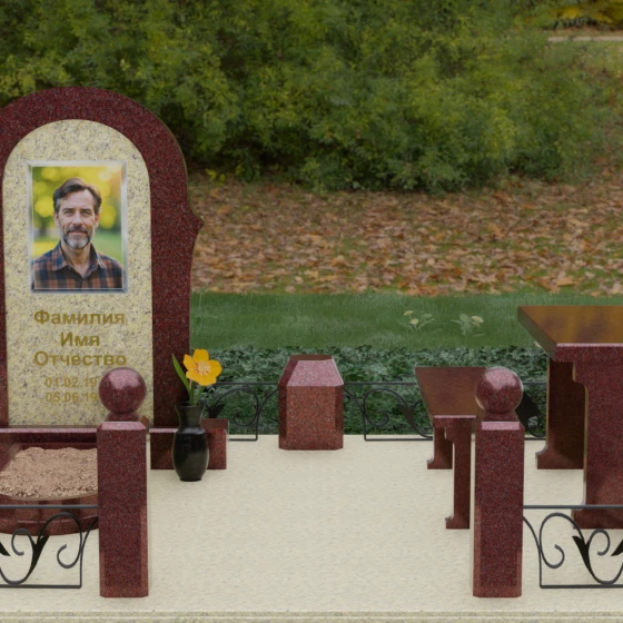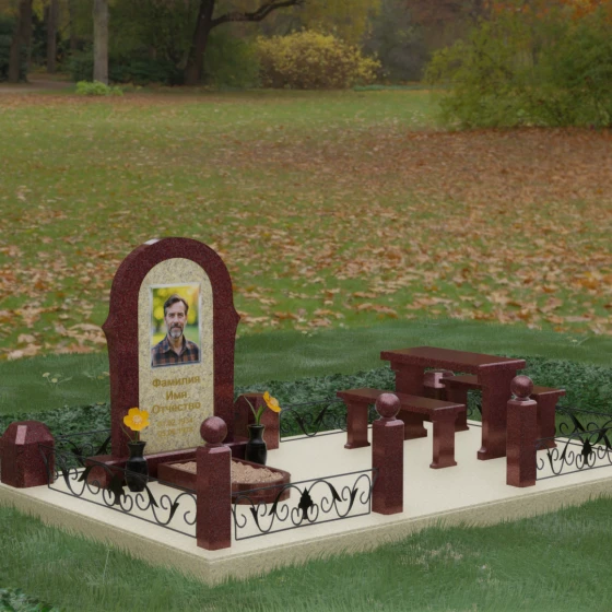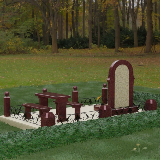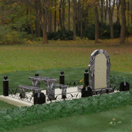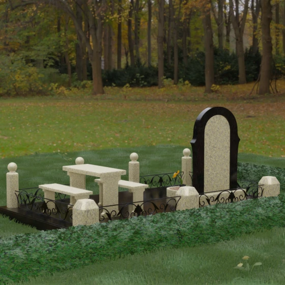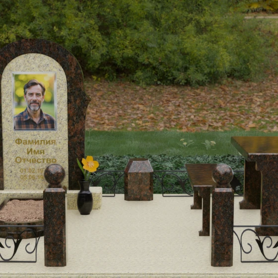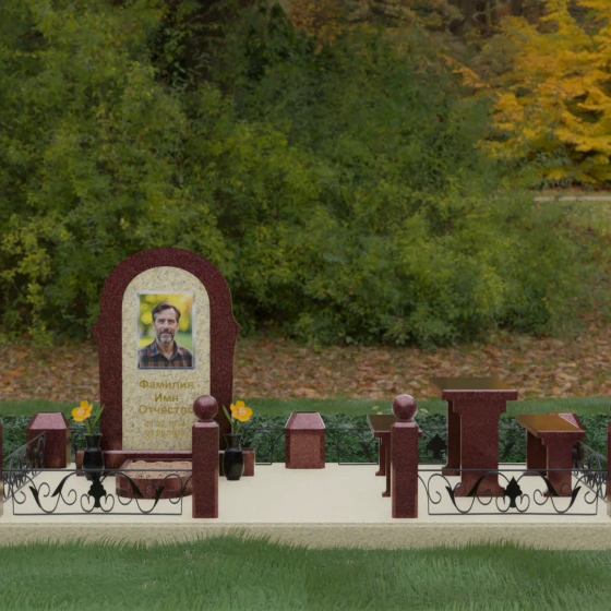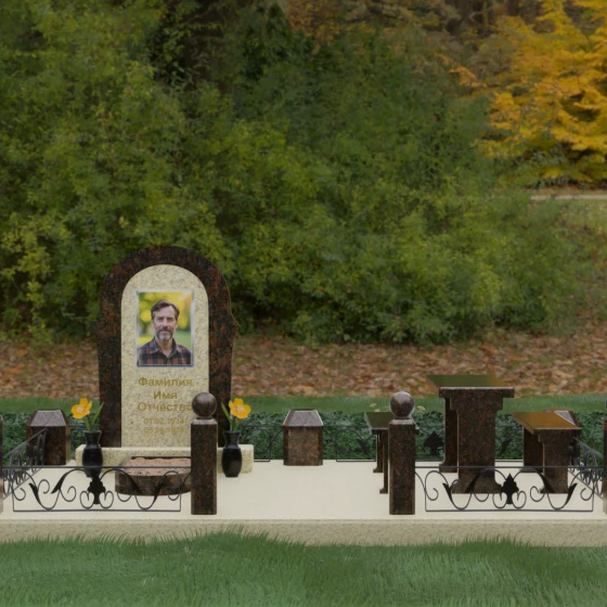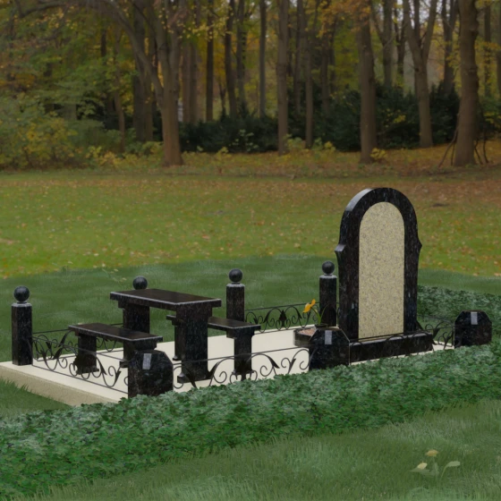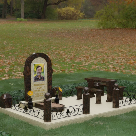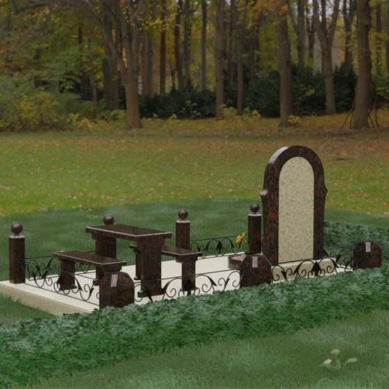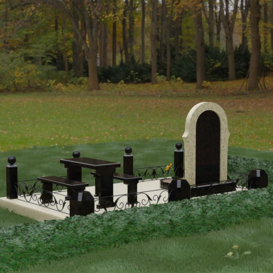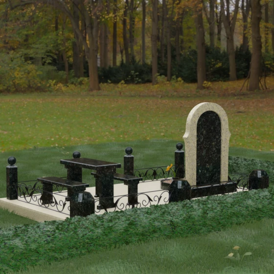 • Элементы благоустройства: Монолитный цоколь, каменное мощение, декоративные вазы, кованое ограждение с гранитными столбами, мемориальный стол и лавки.