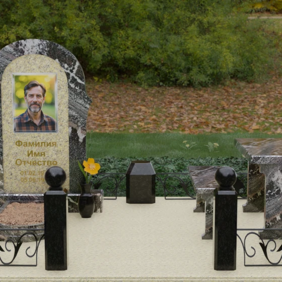 Представленная мемориальная композиция (Артикул 084) являет собой образец безупречного архитектурного баланса и глубокого символизма. Центральным элементом ансамбля выступает величественная вертикальная стела, выполненная в форме классической арки. В искусстве арка традиционно олицетворяет портал, символический переход из земного бытия в мир вечной памяти. Особую эстетическую ценность конструкции придает сложное комбинированное обрамление: основное полотно из темного камня заключено в массивную декоративную раму с изящными выступами-«плечиками» в средней части. Эта сложная геометрия граней подчеркивает монументальность изделия, создавая эффект многослойности и торжественности.