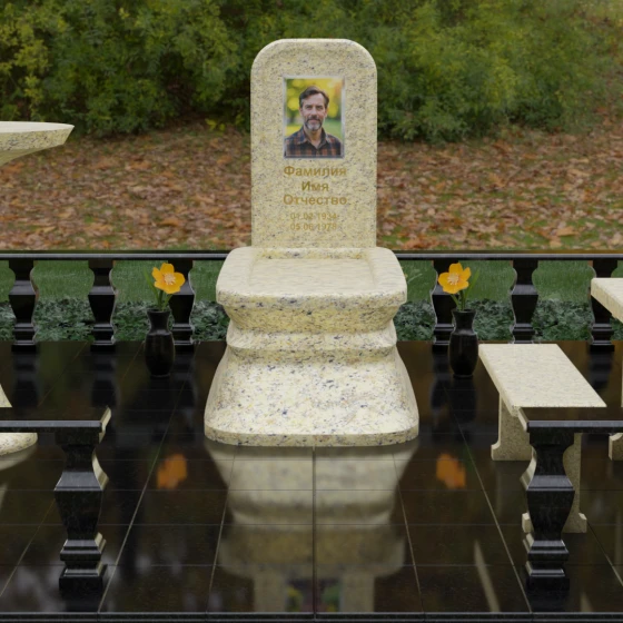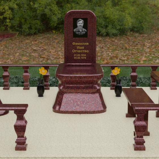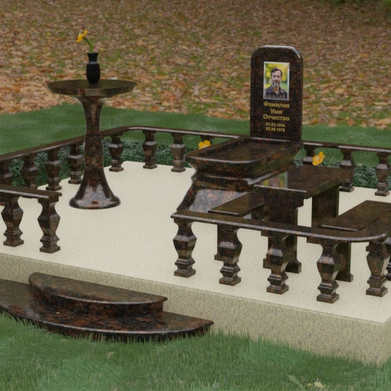 - Массивный гранитный стол и две скамьи на резных опорах, позволяющие близким в уединении провести время в воспоминаниях;