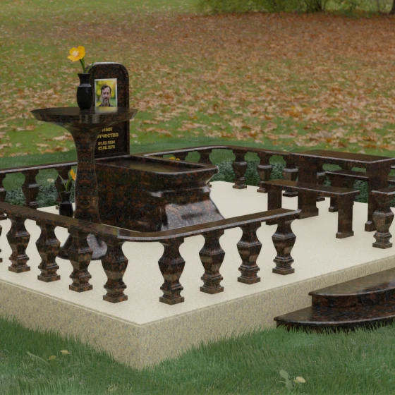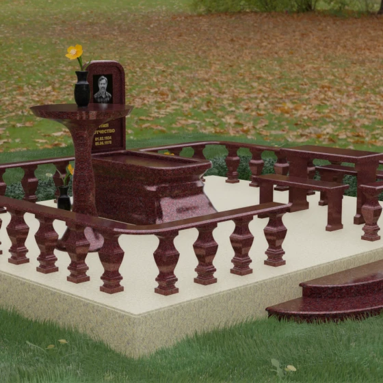 Форма данного надгробного сооружения наполнена глубокими смыслами. Высокая стела, устремленная вверх, символизирует путь души к свету, а её основательность и широкий постамент — незыблемость земной памяти. Закрытая территория, очерченная каменным ограждением, создает сакральное пространство, защищенное от суеты внешнего мира, обеспечивая покой и защиту. Каждая деталь — от фасок на гранях до плавных изгибов балясин — говорит о завершенности жизненного пути и вечности, в которой теперь пребывает ушедший.